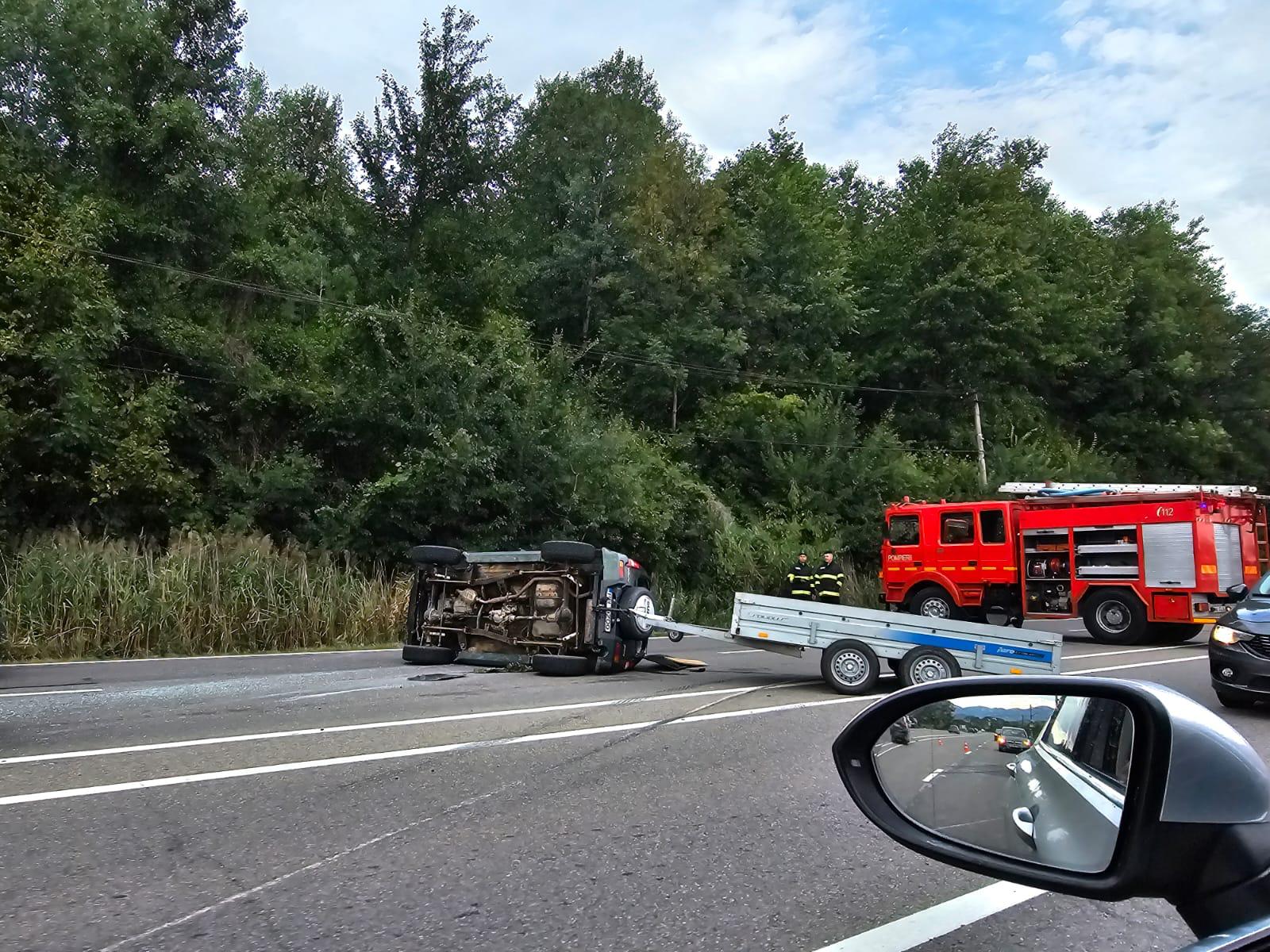 „Este implicat un autoturism cu remorcă, încărcată cu pietriș, care s-a răsturnat pe partea carosabilă.