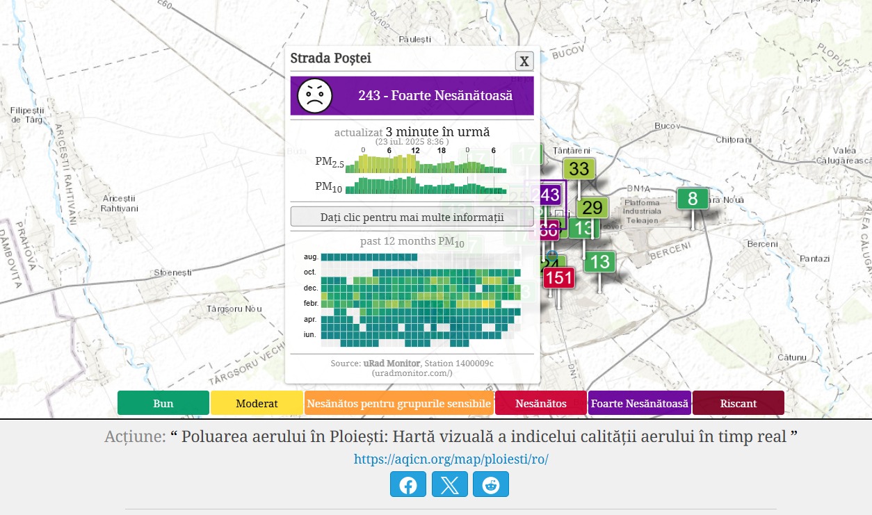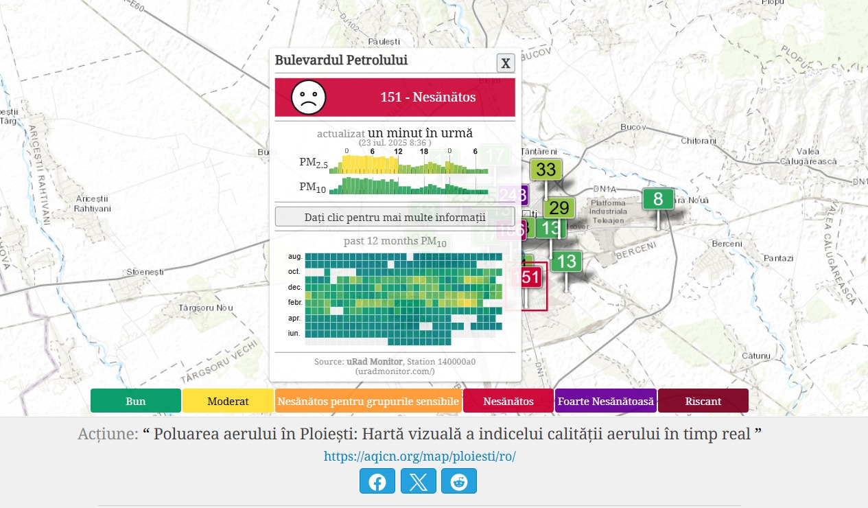 Miercuri dimineață, 22 iulie 2025, mai multe zone din Ploiești s-au confruntat cu un nivel alarmant de poluare a aerului, conform datelor înregistrate de platforma internațională de monitorizare a calității aerului www.aqicn.org.