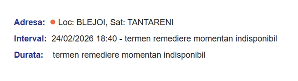 Pe site-ul companiei Distribuție Energie Electrică România (DEER) apare întreruperea curentului electric în localitatea Blejoi, sat Țânțăreni, termenul pentru remediere fiind, deocamdată, indisponibil.