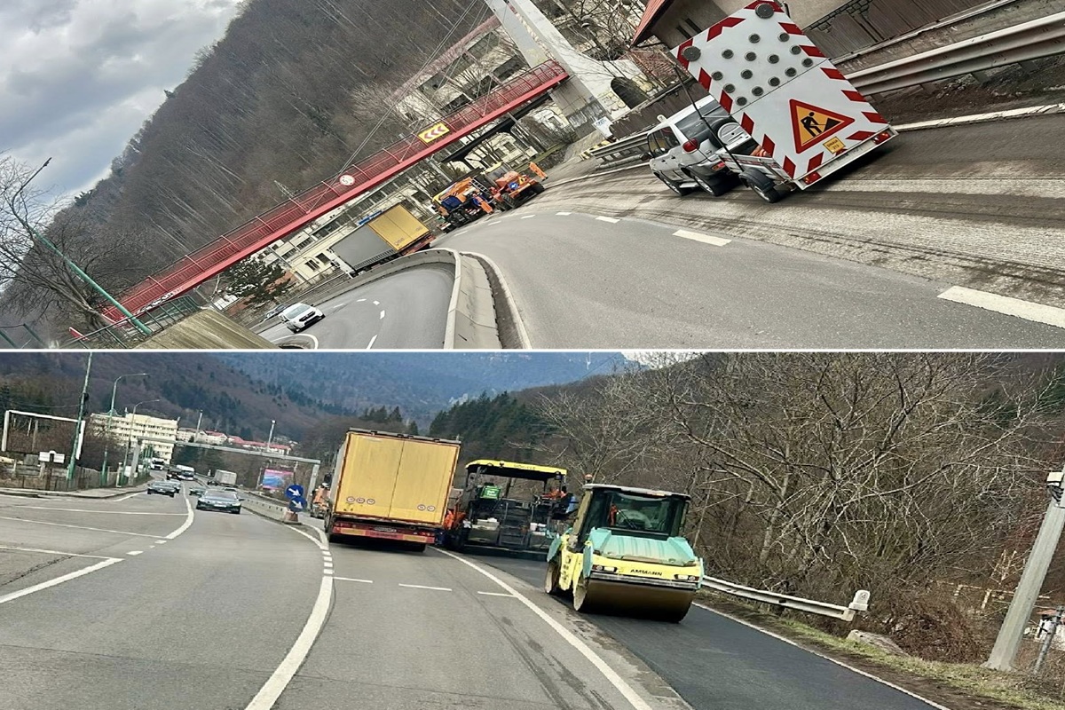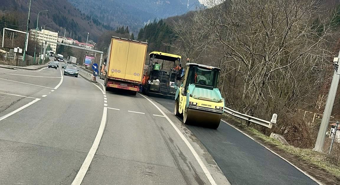 Angajații Secției de Drumuri Ploiești execută joi după amiază lucrări de întreținere a carosabilului pe DN1 în Prahova, la Sinaia.