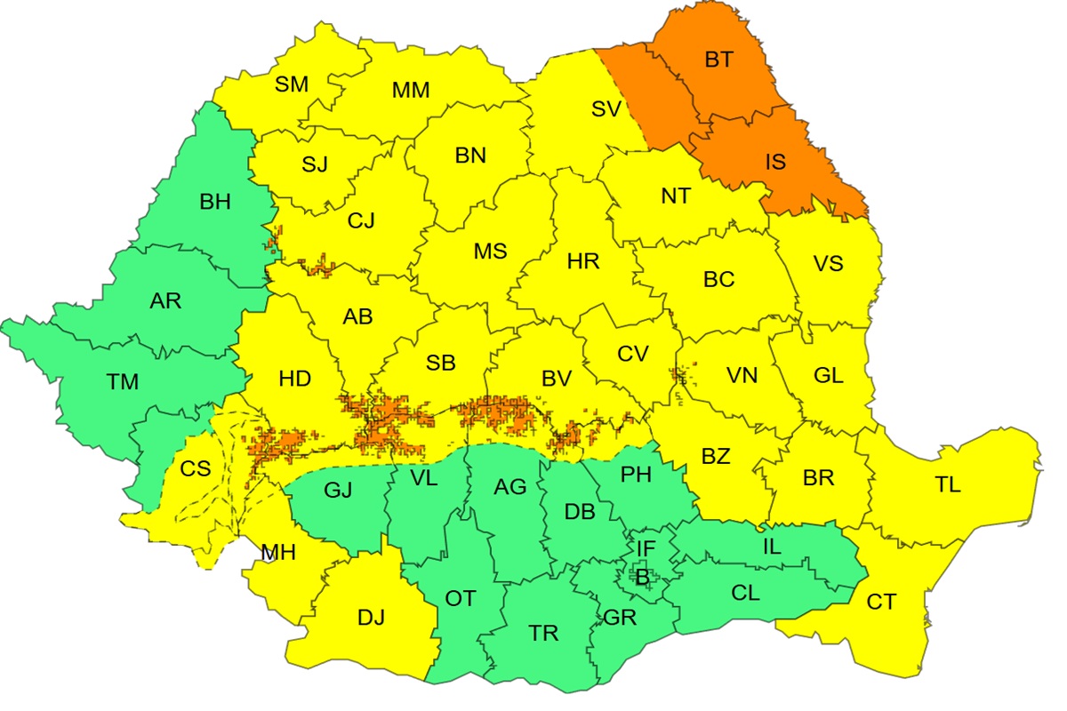 De asemenea, tot joi, va fi în vigoare un cod portocaliu de vânt, între orele 12:00 și 20:00.