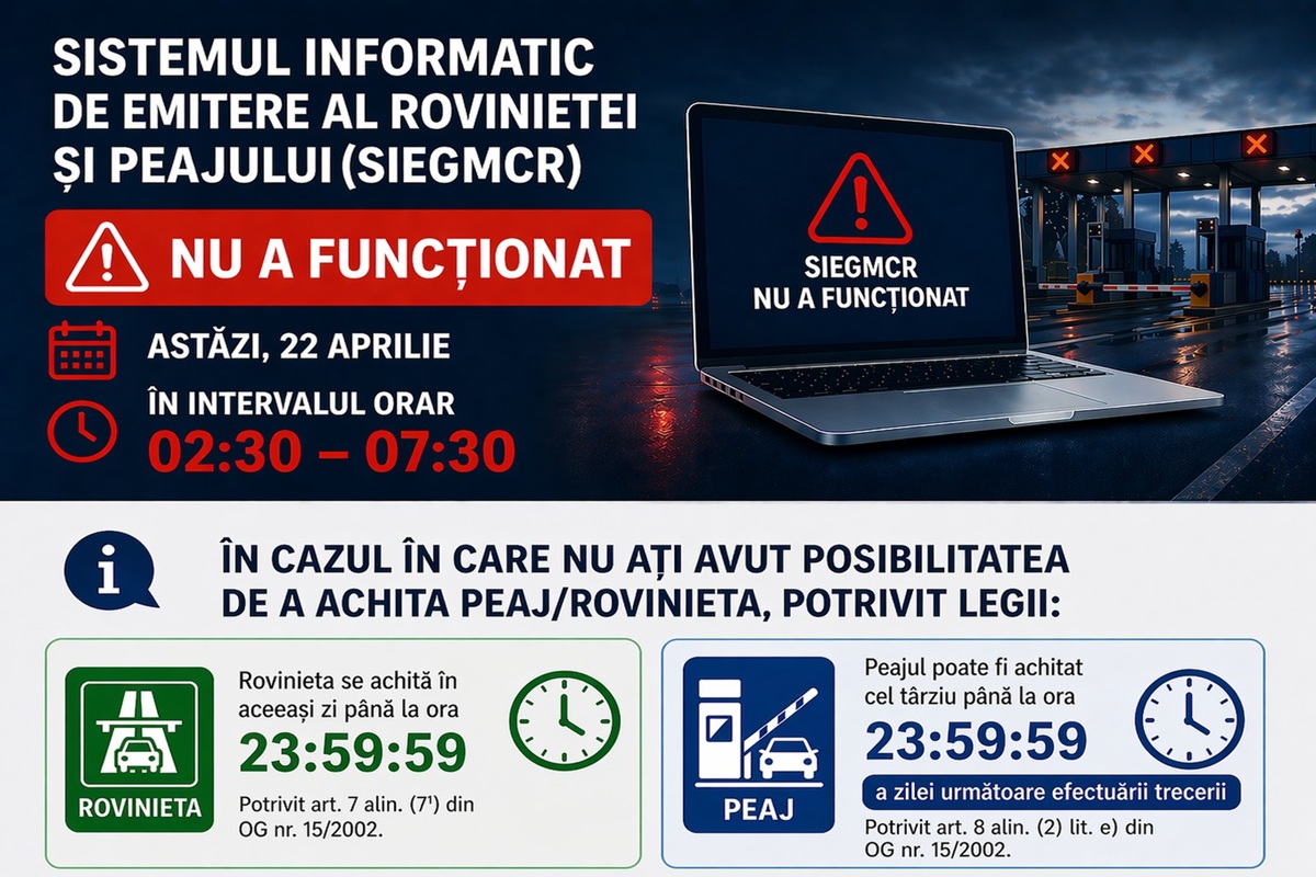 „Sistemul informatic de emitere a rovinietei și peajului este funcțional! CNAIR informează utilizatorii rețelei rutiere naționale că în data de 22.04.2026, în intervalul orar 02:30 AM – 07:30 AM, sistemul informatic de emitere a rovinietei și a peajului nu a funcționat din cauza unor fluctuații mari de tensiune ale rețelei de alimentare cu energie electrică.