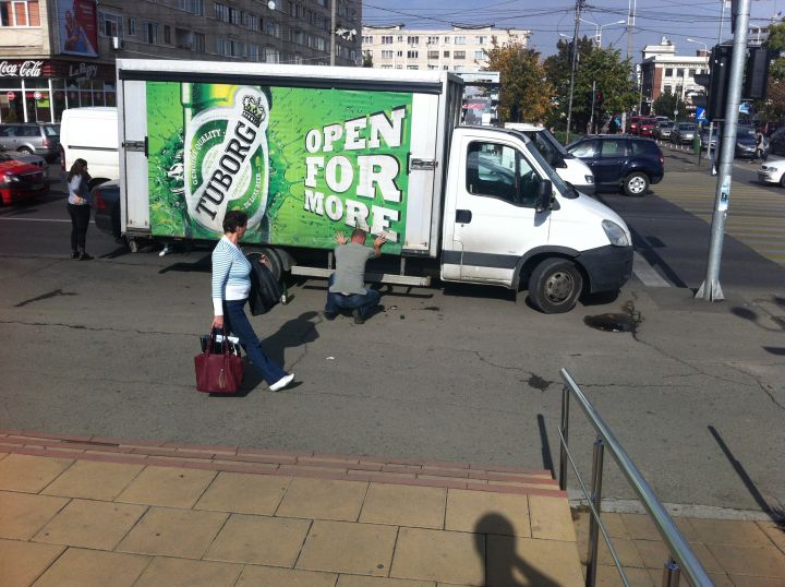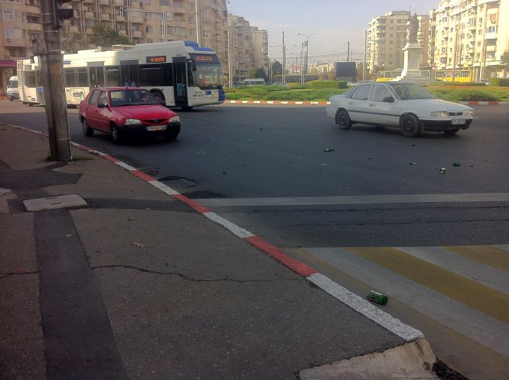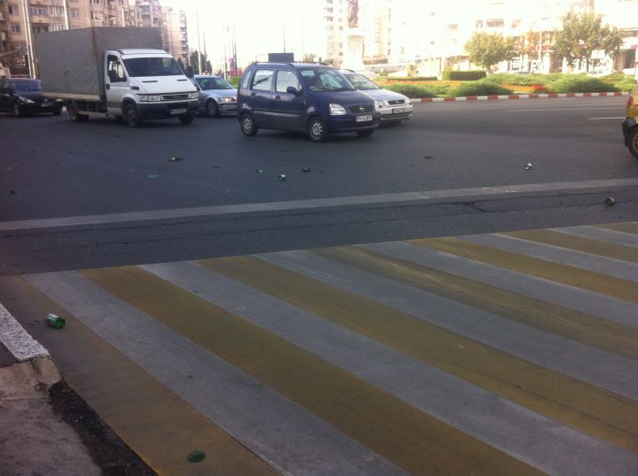 Incidentul a avut loc în urmă cu puțin timp (14.50), pe sensul de mers Nord – centru – Gara de Sud. În momentul în care culoarea de la semaforul din sensul giratoriu s-a făcut verde, șoferul utilitarei a accelerat, moment în care o chingă de la prelată s-a desfăcut și au început să cadă sticle pe carosabil. Șoferii care erau în spatele autoutilitarei nu au avut cum să mai ocolească zona. Așa că mulți au intrat cu roțile direct în sticlele sparte. Inclusiv șoferii troleelor au fost nevoiți să evite zona, motiv pentru care au deconectat vehiculele de la curentul electric și au trecut pe combustibil. Prin urmare, dacă nu doriți să aveți cauciucurile sparte, precum unul dintre șoferii care deja au pățit necazul, evitați zona.