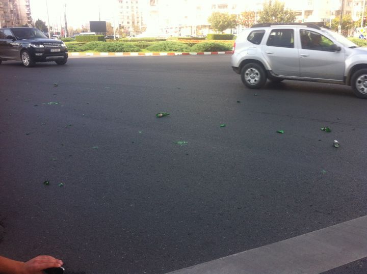 Anunțul este destinat șoferilor, care au drum prin sensul giratoriu de la Catedrala Sf. Ioan din Ploiești. Dacă nu este urgent, mai bine evitați zona. Altfel riscați să vă alegeți cu anvelopele tăiate, după ce zeci de sticle goale de bere au picat dintr-o autoutilitară de transport marfă și s-au împrăștiat pe asfalt.