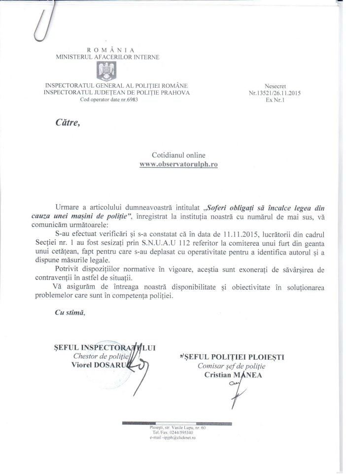 IJP Prahova a răspuns solicitării ziarului nostru, iar explicația pentru această situație se pare că a fost necesitatea unei intervenții pentru un caz de furt. Vezi mai jos răspunsul complet al IJP Prahova.