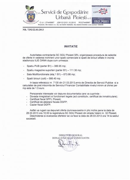Pe 22 martie, conducerea SGU publică pe site-ul instituţiei următorul anunţ:  INVITATIE/ Autoritatea contractanta SC SGU Ploiesti SRL organizeaza procedura de selectie de oferte in vederea inchirierii unor spatii comerciale si spatii de birouri aflate in incinta stadionului ILIE OANA dupa cum urmeaza :