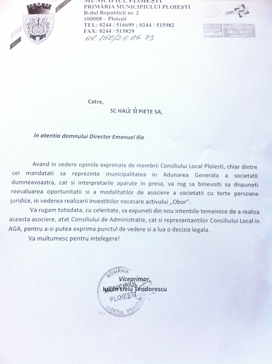 Astăzi, viceprimarul Ploieştiului, Iulian Teodorescu, i-a transmis directorului Hale şi Pieţe SA şi totodată colegului său de partid (PNL), Emanuel Ilie, o adresă oficială prin care îi solicită anularea procedurii şi reevaluarea oportunităţii de a da oborul unei firme private!