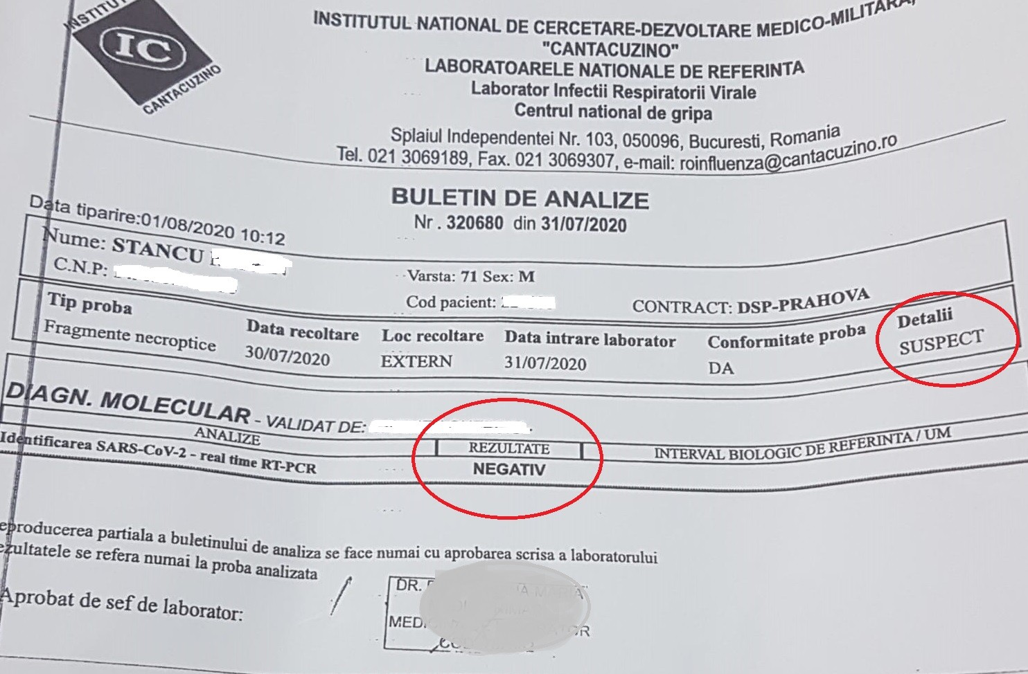 Deci trei cereri am făcut pentru prelevarea probei… Inclusiv mama, care nu putea să meargă, am luat-o cu mine. Am reușit până la urmă. Pe data de 30 (n.r. 30 iulie) s-a prelevat proba, iar pe 1 august le-a trimis rezultatul la DSP. Domnul doctor nu s-a informat dacă a venit rezultatul ca să ne putem lua tatăl acasă. Am așteptat până miercuri. Săptămâna aceasta, am venit luni, marți, la Schuller (n.r. Morga), însă ni s-a spus să nu mai venim… <<Stați acasă, că vă sunăm noi, miercuri sigur!>>, ne-a spus. Am văzut că nu ne-a sunat domnul doctor. Am sunat la Institutul Cantacuzino, iar de acolo ni s-a spus că rezultatul este trimis de sâmbăta trecută, după data de 1 august și este negativ. Noi am fost ieri de am luat rezultatul și toată povestea s-a întâmplat până astăzi. Dacă nu aveam rezultatul, nici astăzi nu reușeam să-l luăm.