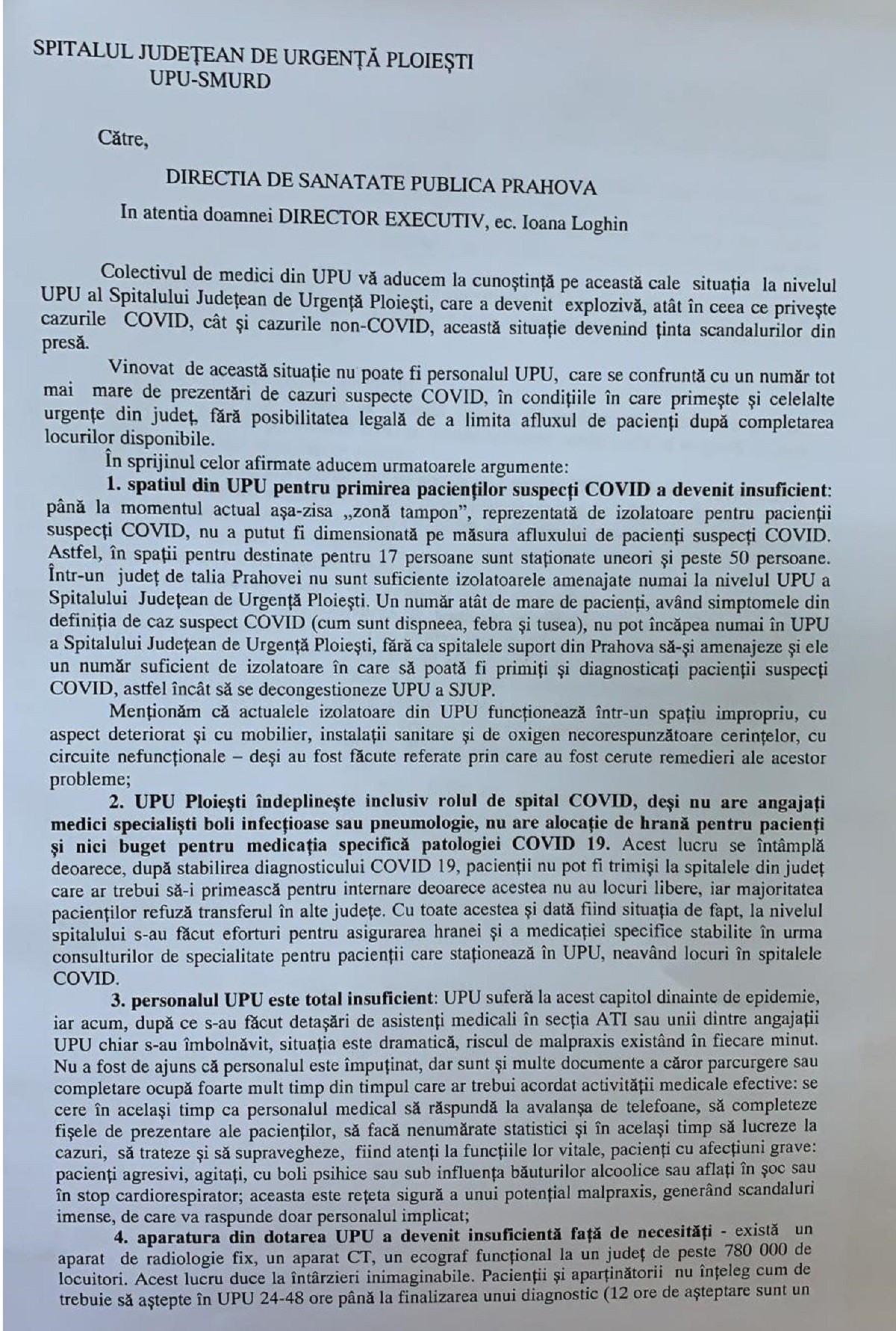 Medicii de la Unitatea de Primiri Urgențe a Spitalului Județean de Urgență Ploiești au transmis, luni, o scrisoare către conducerea unității medicale, dar și către Direcția de Sănătate Publică Prahova, în care reclamă faptul că situația a devenit explozivă, atât din cauza cazurile Covid, dar și non-Covid.
