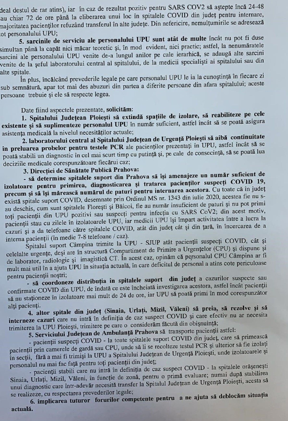 În scrisoarea transmisă, medicii de la Unitatea de Primiri Urgențe Ploiești cer, totodată, ca Direcția de Sănătate Publică Prahova să determine spitalele suport din județ să-și amenajeze izolatoare pentru primirea, diagnosticarea și tratarea pacienților suspecți Covid-19.
