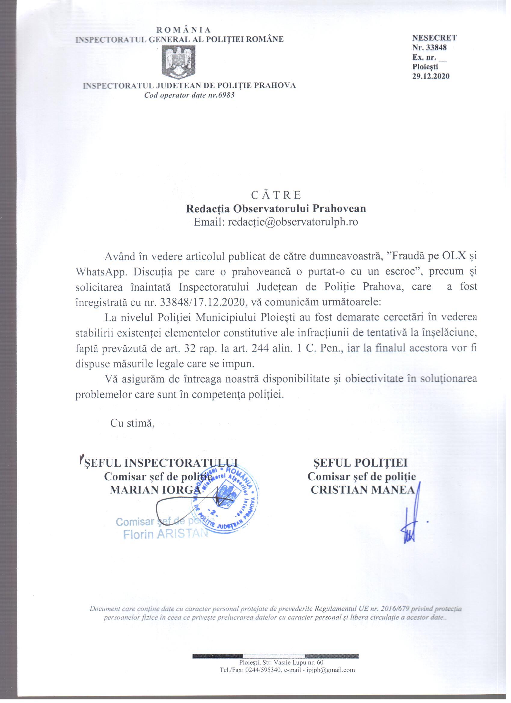 După ce observatorulph.ro a publicat articolul Fraudă pe OLX și WhatsApp. Discuția pe care o prahoveancă a purtat-o cu un escroc, la solicitarea redacției noastre IJP Prahova a demarat o anchetă, așa cum reiese din documentul transmis: