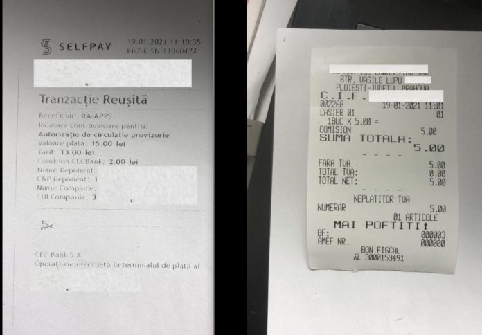 La vremea respectivă un alt cititor ne-a sesizat pe adresa redacției că a plătit 100 de lei pentru ca un angajat al unui birou de copiat acte să-i introducă datele pe site-ul Prefecturii Prahova în vederea programării online la înmatricularea mașinii. Evident, nu a primit bon fiscal dintr-un motiv cât se poate de simplu: o astfel de taxă nu exista!