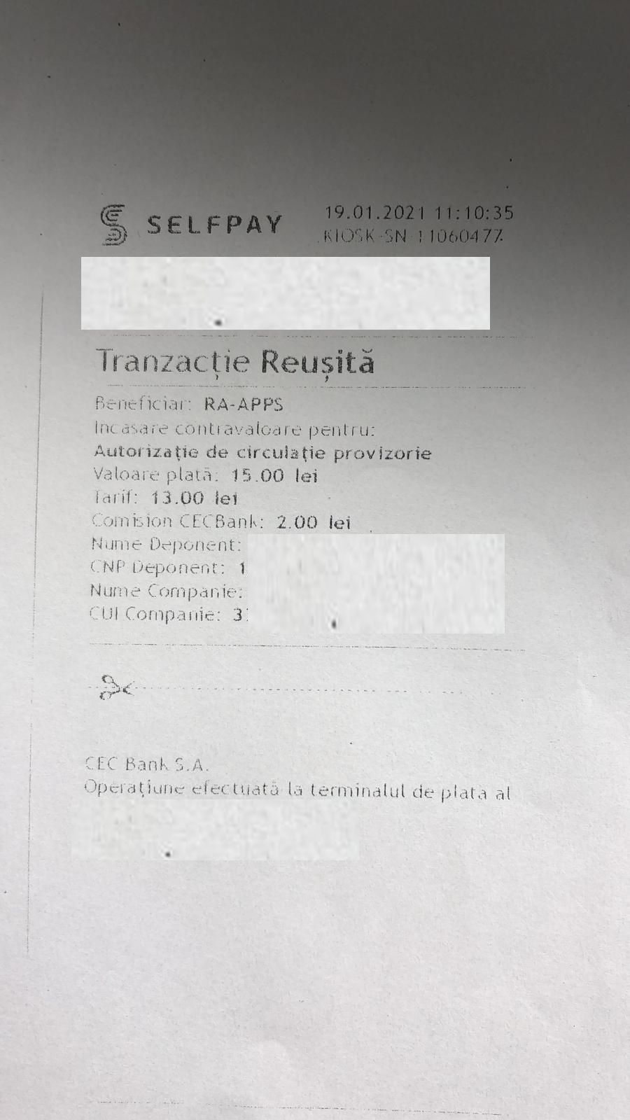 ”Astăzi m-am prezentat la ghișeul serviciului de înmatriculări auto de pe strada Vasile Lupu, unde am aflat că taxa pentru autorizația provizorie, în valoare de 13 lei, nu se mai achită la Poliție, ci online sau prin BCR și CEC. Pentru că mă grăbeam, am fost îndrumat la unul dintre comercianții de peste drum de sediul IJP, care dispune de un aparat de tip SelfPay.