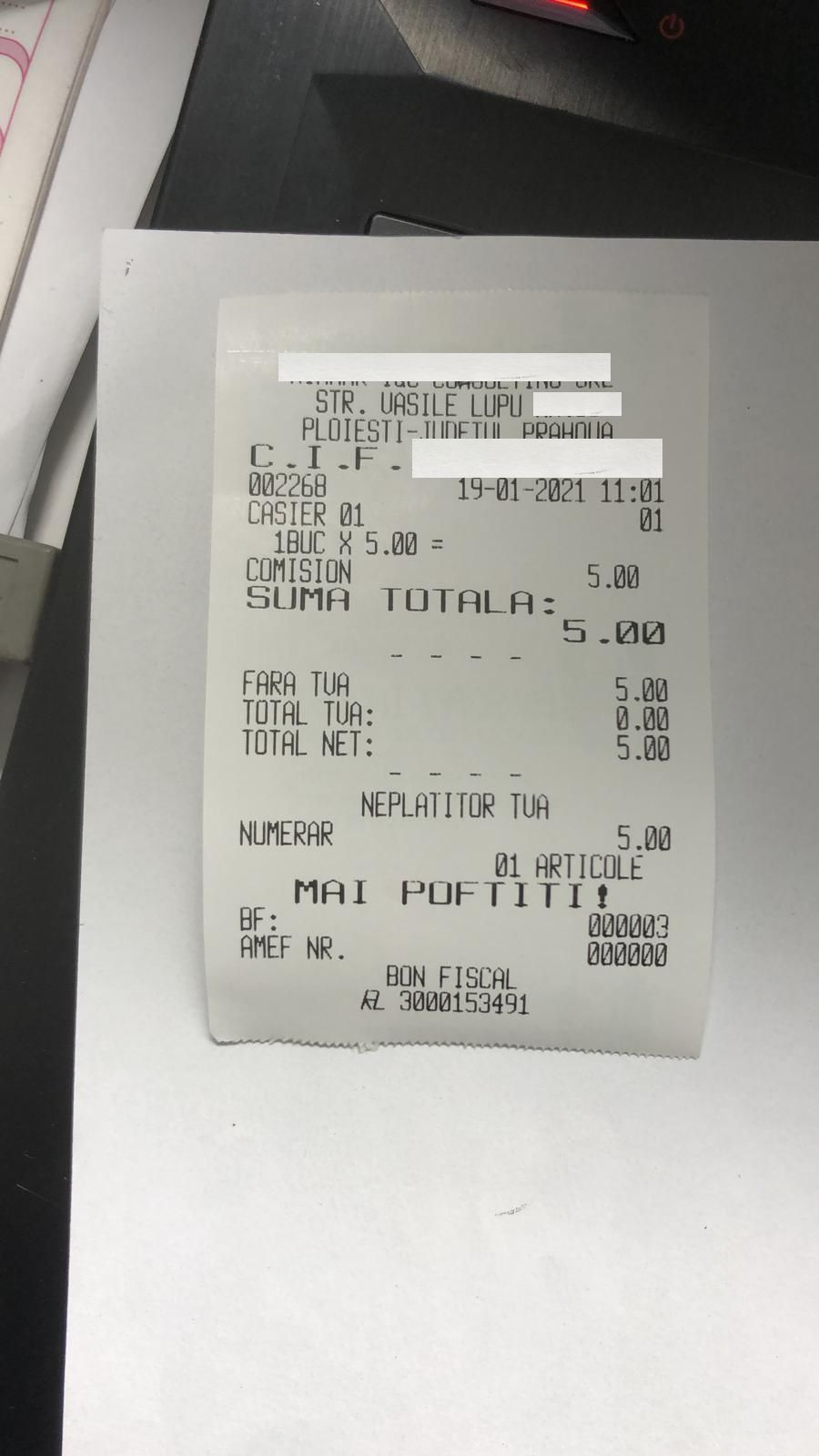 Când am întrebat-o de ce nu mă lasă pe mine să fac asta mi-a răspuns că aceasta este procedura. I-am cerut bon fiscal și mi-a dat unul pe care scrie doar ”comision” în valoare de 5 lei, restul de doi lei constituind un alt comision încasat de CEC.