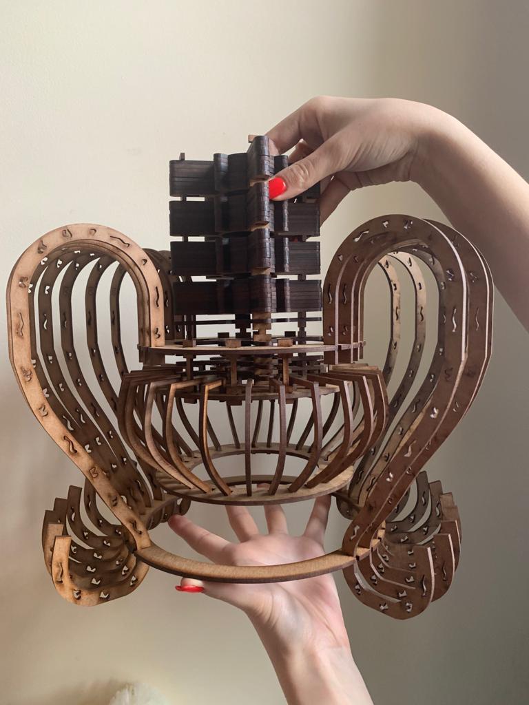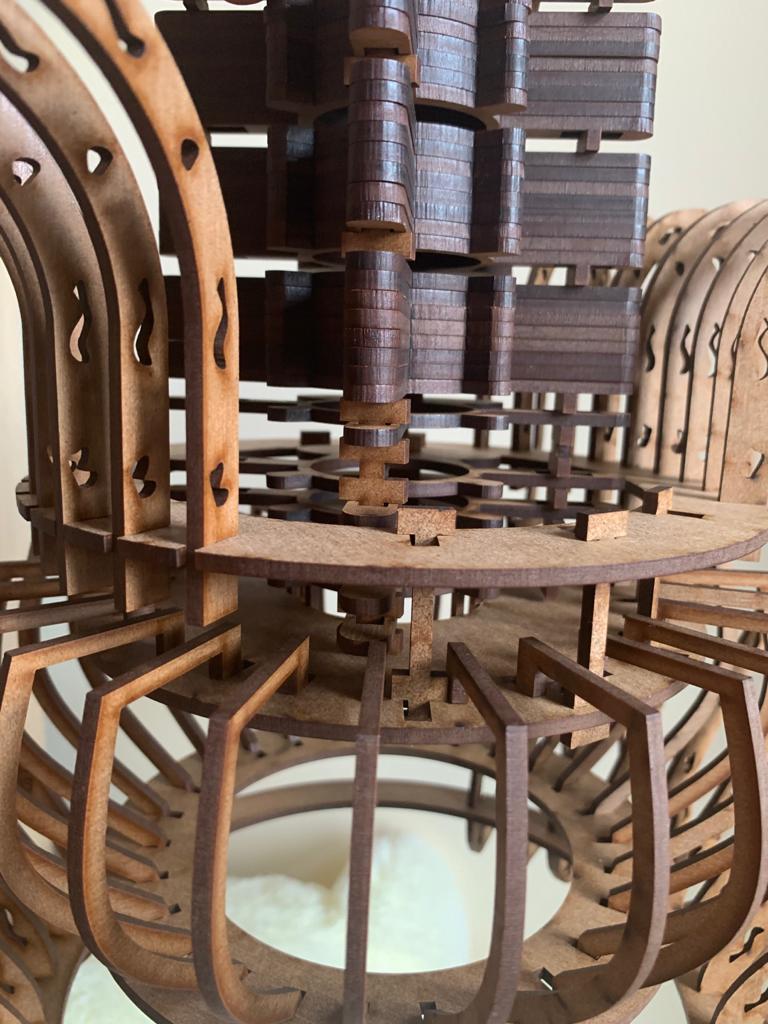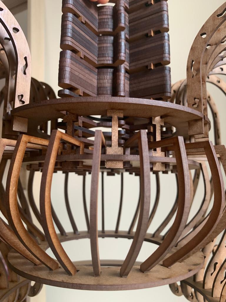 Alexandra Ioana spune că cel mai important proiect ce-i aparține vine din partea cursului de master: un obiect de iluminat ce nu depășește 30x30x30 de cm, este în totalitate din MDF, piesele sunt toate conectate fără lipici, iar produsul are o rotație de 360 de grade.