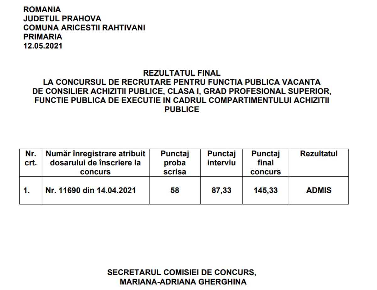 Până în luna aprilie a acestui an, Primăria Ariceștii Rahtivani avea un angajat în cadrul Compartimentului Achiziții publice din aparatul de specialitate al Primarului. Atunci, primăria a scos la concurs un post vacant de consilier achiziții publice, clasa I, grad profesional superior, finalizat cu succes pe 12 mai prin angajarea unui specialist.