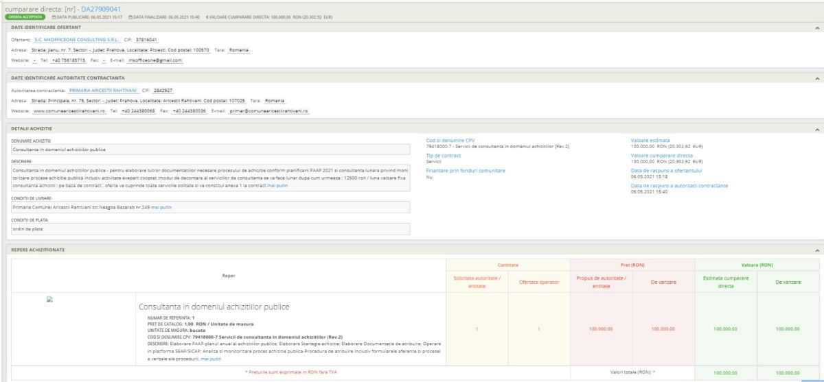 Valoarea contractului, încheiat pe o durată de 8 luni, este de 100.000 de lei, adică 12.500 de lei/lună.
