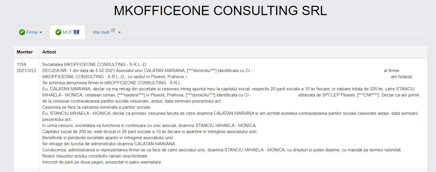În martie 2021, Mihaela Monica Stanciu preia firma de consultanță:
