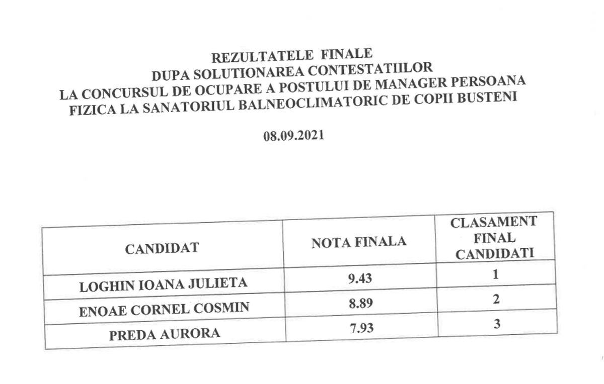 Directorul DSP Prahova, Ioana Loghin, a câștigat concursul de manager la Sanatoriul Balneoclimateric De Copii din Bușteni. Rezultatul final al concursului a fost publicat pe 8 septembrie, după ce comisia de soluționare a respins cele două contestații formulate de contracandidații șefei DSP Prahova. Din comisia de evaluare a candidaților au făcut parte doi reprezentanți ai DSP Prahova, adică subalternii candidatului Loghin, desemnat și câștigătorul concursului.