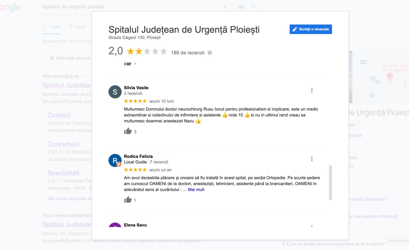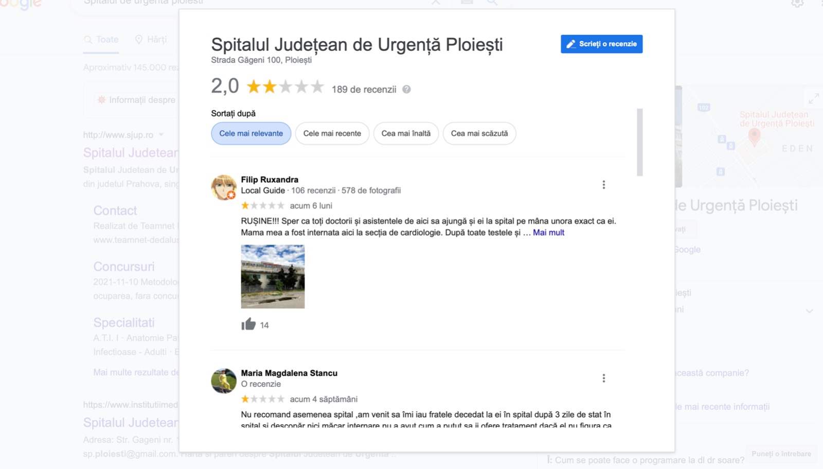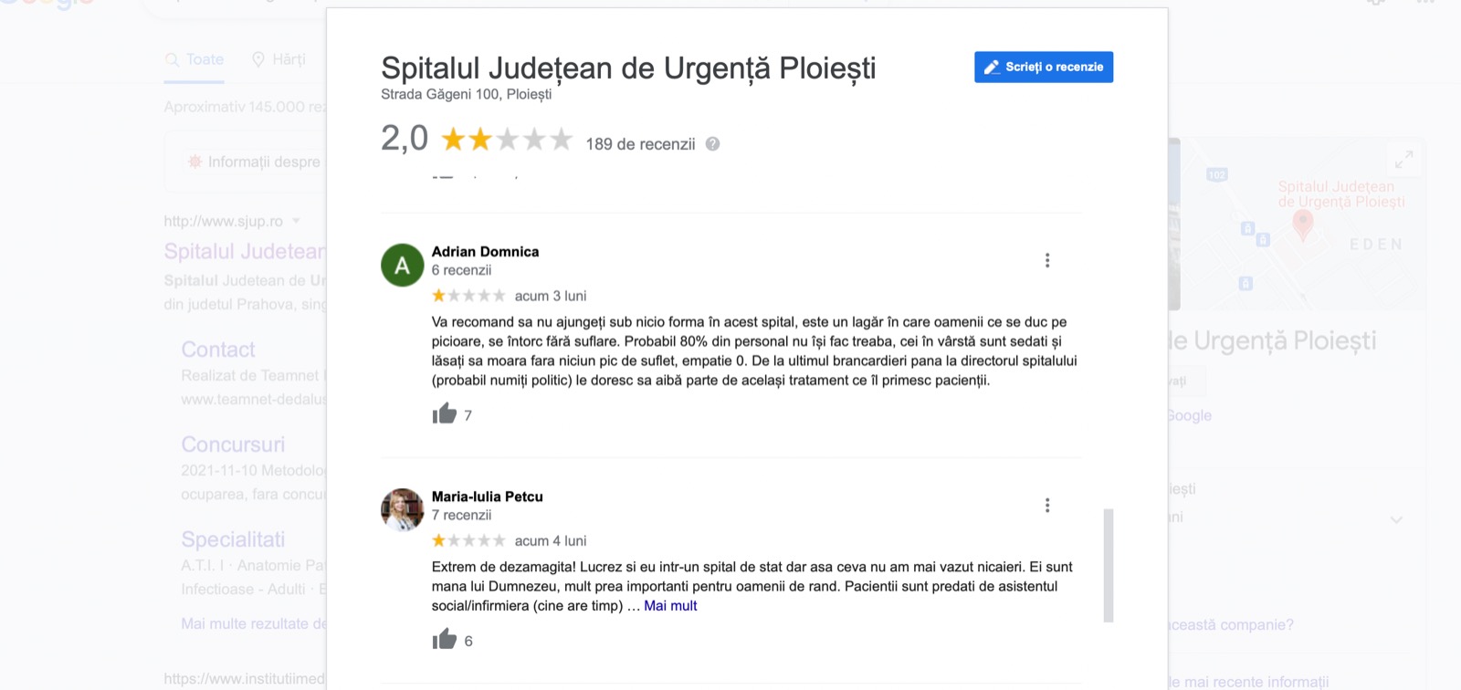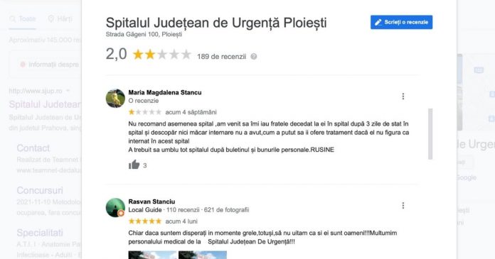 Pe Google, Spitalul Județean de Urgență Ploiești primește zeci de mesaje negative. Recenziile utilizatorilor subliniază dezastrul din sistemul sanitar și implicit din această instituție.