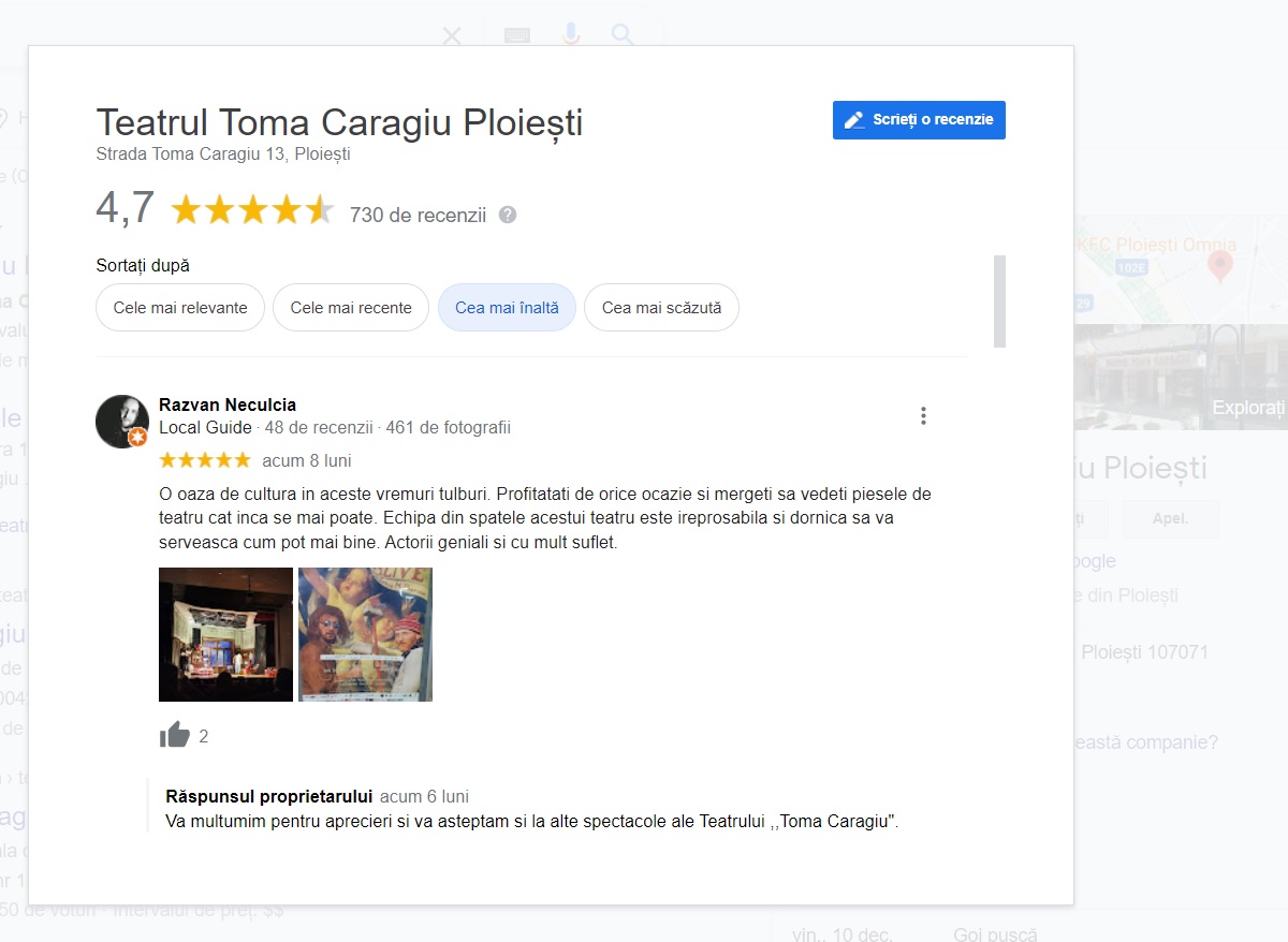 Ce note dau prahovenii instituțiilor publice pe Google. Teatrul Toma Caragiu: „Un loc încărcat de istorie, un loc unde te relaxezi, piese de teatru superbe, actori dedicați meseriei. Recomand 100%”