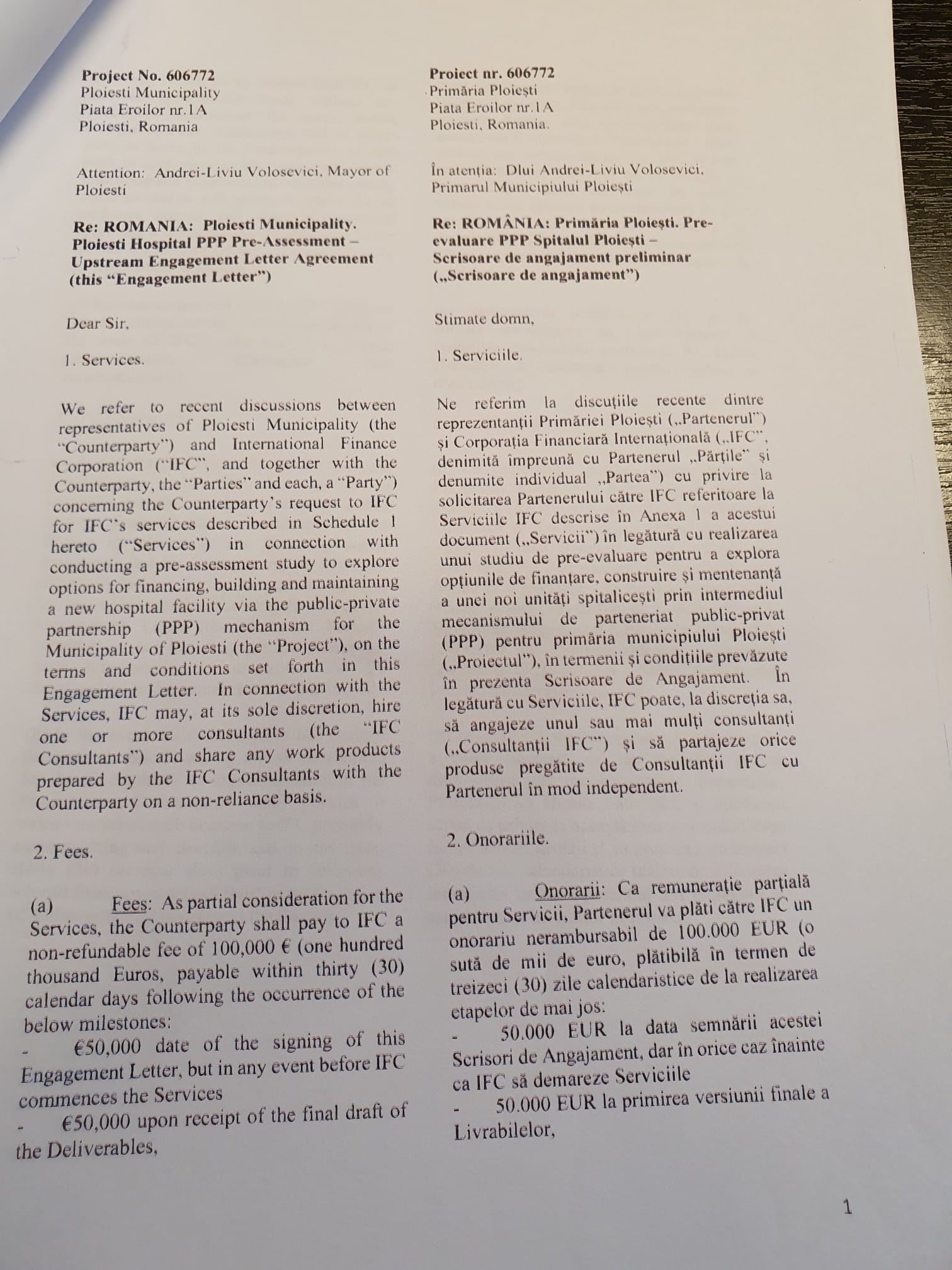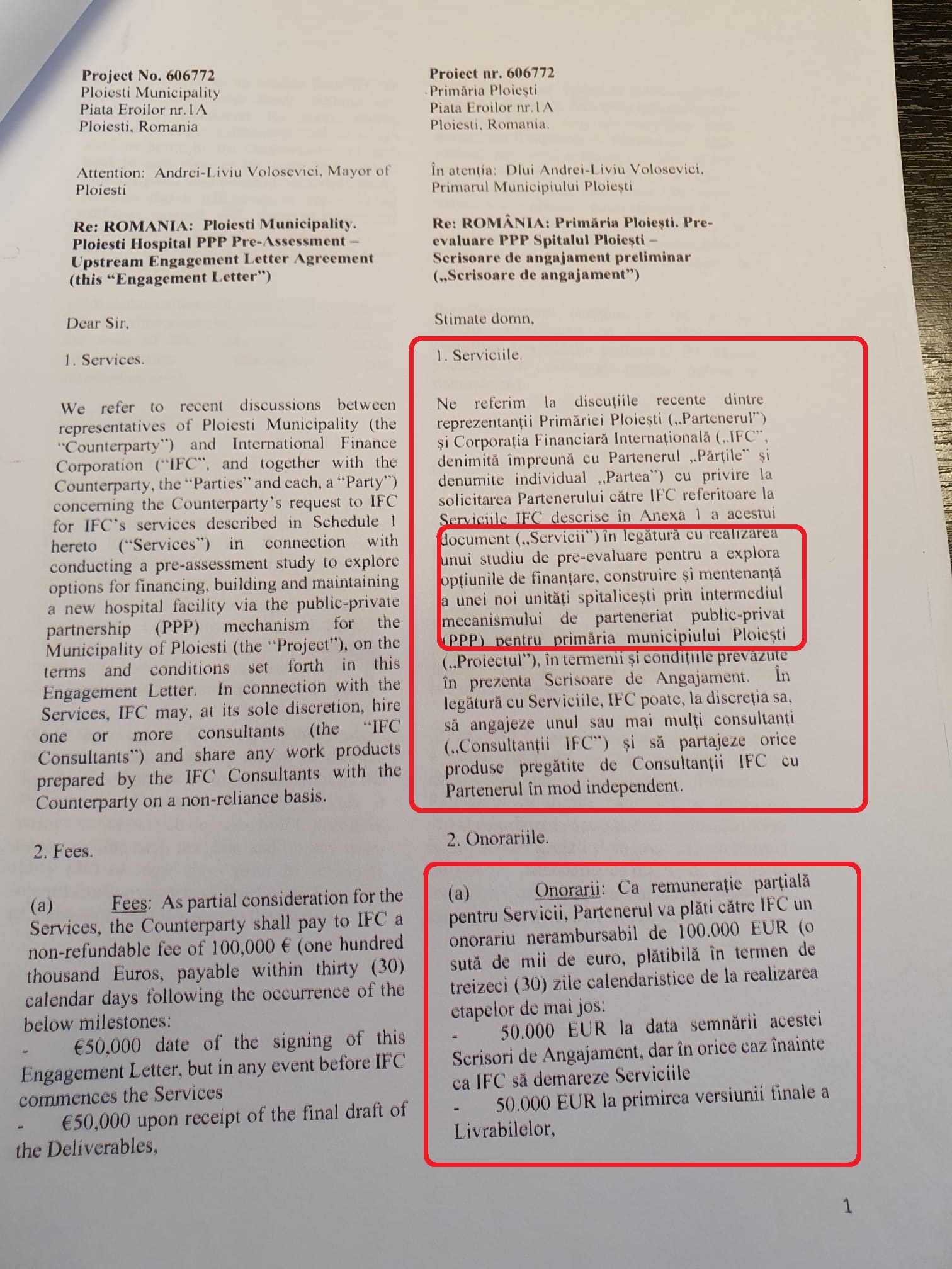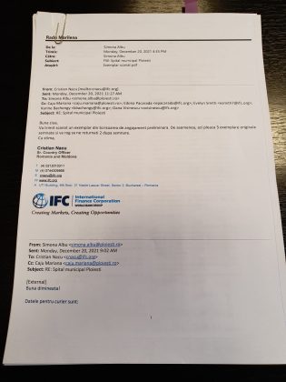Potrivit scrisorii, IFC va încasa un comision de 100.000 de euro de la Primăria Ploiești pentru a întocmi un studiu de pre-evaluare pentru a explora opțiunile de finanțare, construire și mentenanță a unui spital municipal de urgență printr-un parteneriat public privat.