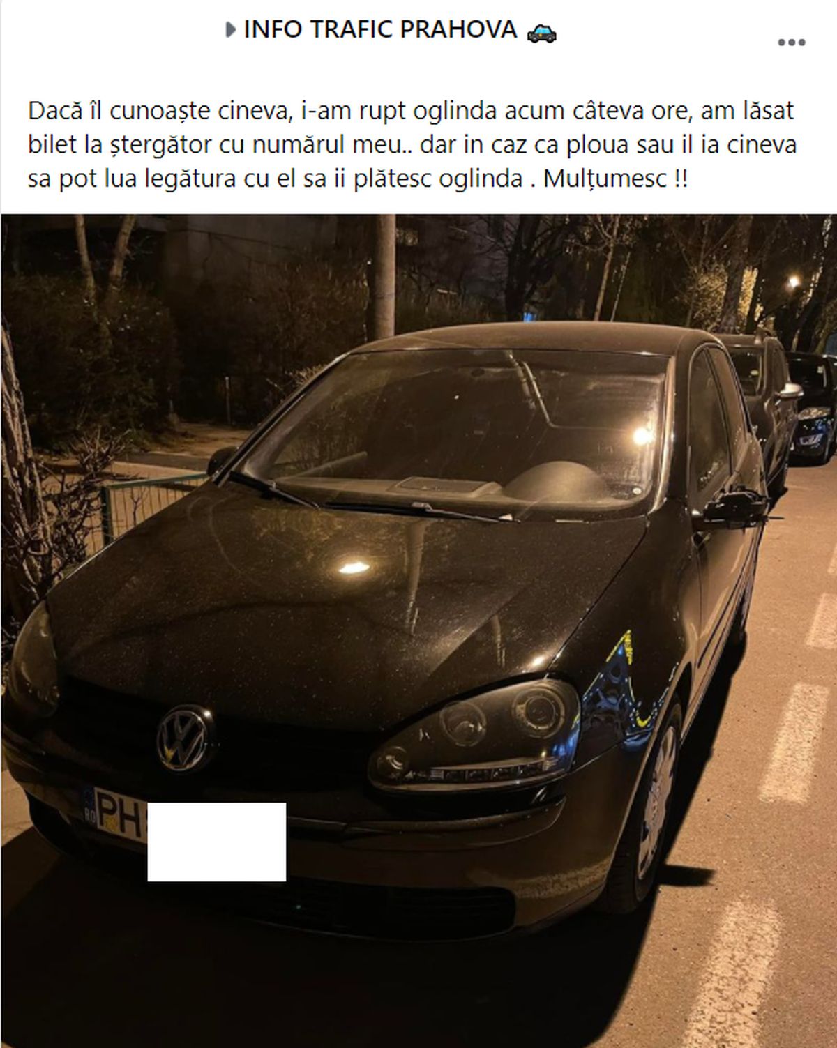 ”Dacă îl cunoaște cineva, i-am rupt oglinda acum câteva ore, am lăsat bilet la ștergător cu numărul meu.. dar in caz ca ploua sau il ia cineva sa pot lua legătura cu el sa ii plătesc oglinda . Mulțumesc !”