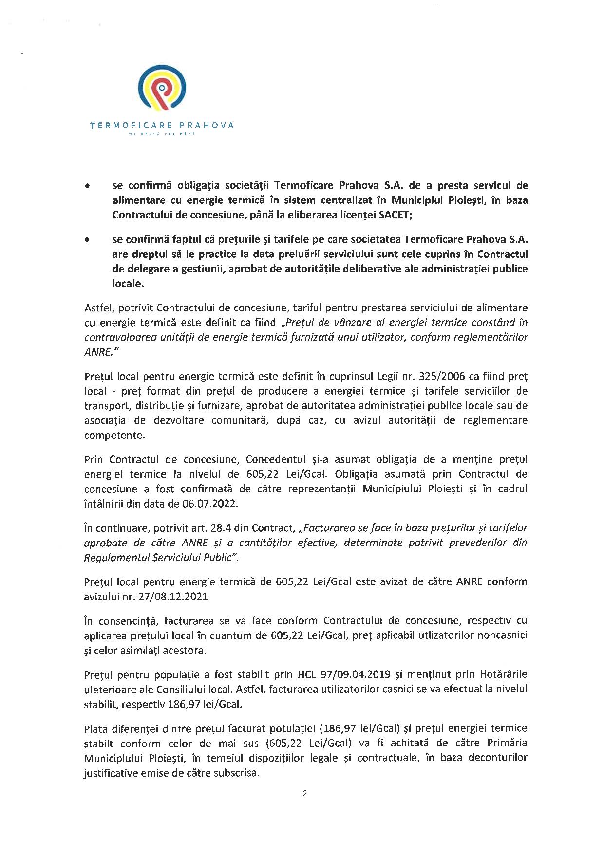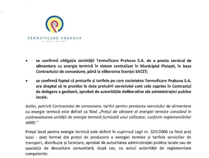 Interesant și merită menționat acest lucru este faptul că operatorul specifică în documentul respectiv că reprezentanții conducerii Primăriei Ploiești s-au întâlnit cu cei ai Termoficare Prahova pentru stabilirea prețului gigacaloriei, în condițiile în care primarul Ploieștiului, Andrei Volosevici, a declarat în numeroase rânduri că nu a existat un dialog cu operatorul.
