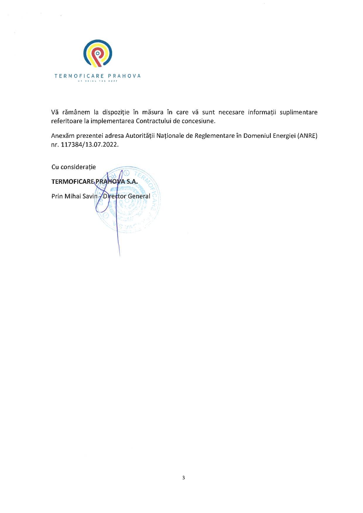 Pe 18 iulie, Termoficare Prahova informa Primăria Ploiești, Consiliul Județean Prahova și ADI Termo Prahova (Asociația care se ocupă de gestionarea contractului) că ANRE a confirmat obligația societății de a presta serviciul de alimentare cu energie termică în sistem centralizat în Municipiul Ploiești. Este vorba inclusiv de apa caldă furnizată celor 130.000 de locatari ai apartamentelor racordate la sistemul public, respectiv instituții publice, inclusiv spitale.