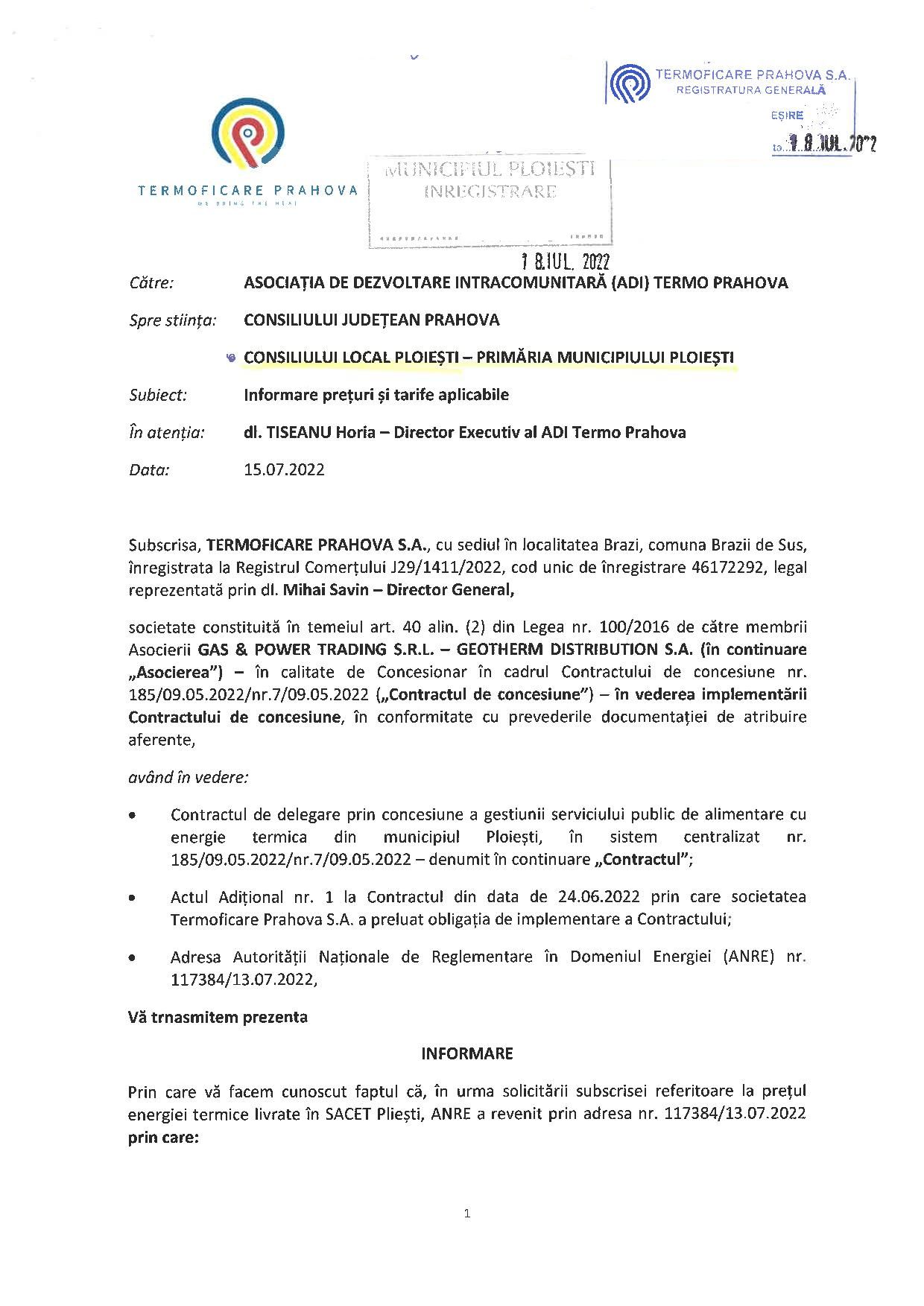 FOTO Document: Pe 18 iulie, conducerea Termoficare Prahova își recunoștea obligația de a presta serviciul de alimentare cu energie termică în sistem centralizat în Municipiul Ploiești