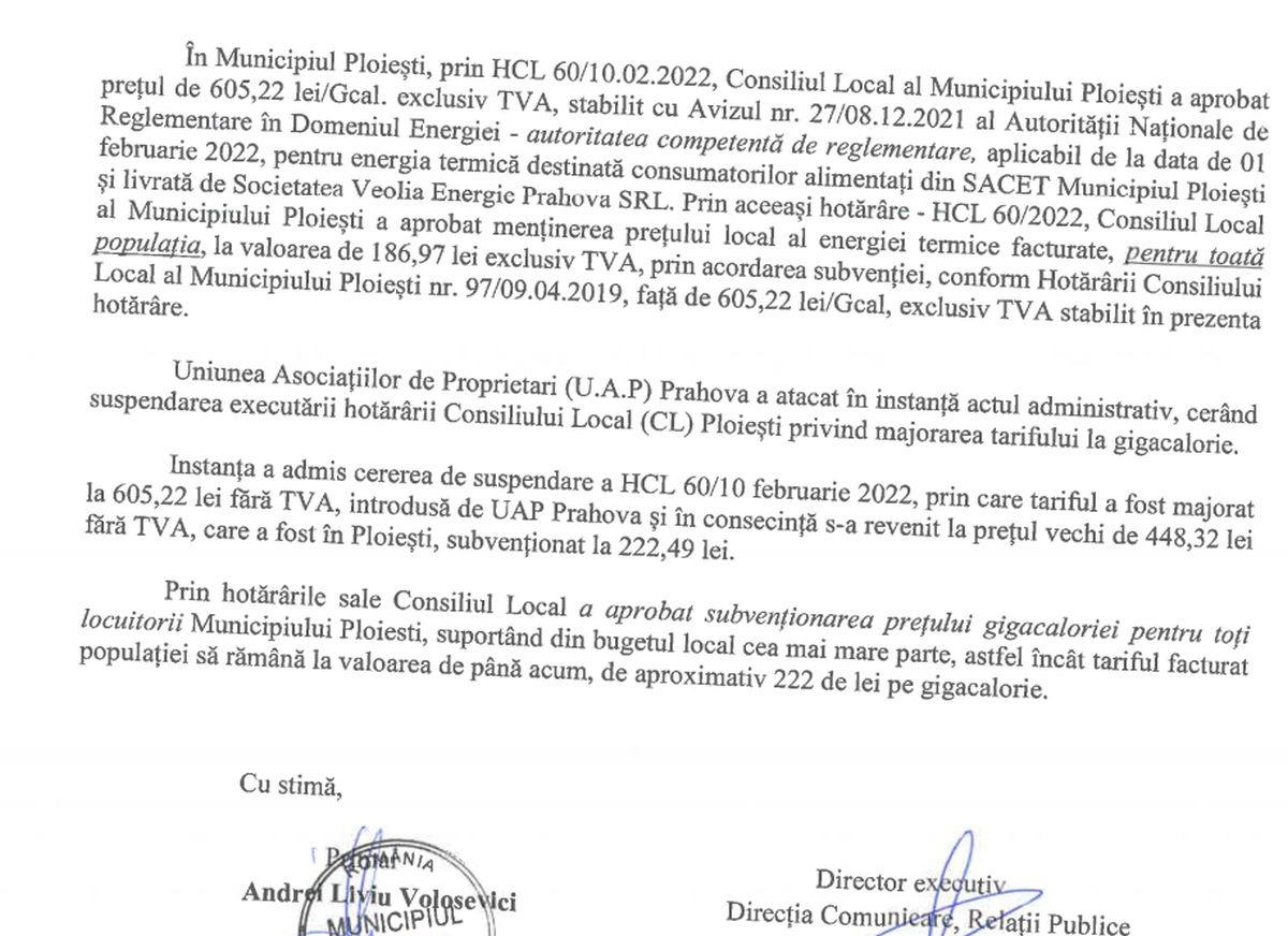 Prin hotarârile sale Consiliul Local a aprobat subventionarea pretului gigacaloriei pentru toti locuitorii Municipiului Ploiesti, suportând din bugetul local cea mai mare parte, astfel incât tariful facturat populatiei sa ramana la valoarea de pana acum, de aproximativ 222 de lei pe gigacalorie.