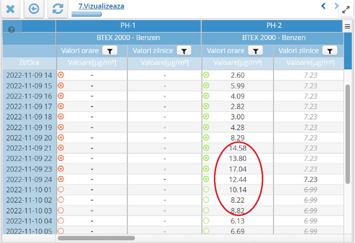În stația PH2, la benzen, pragul maxim, de 14,58 unități/mc, s-a înregistrat, miercuri, la ora 21.00. Asta în condițiile în care valoarea limită anuală pentru protecția sănătății umane este de 5 ug/m3. Valori ridicate la indicativul benzen au fost înregistrate, miercuri seară, și în stația de monitorizare PH 6, ora 20.00, respectiv 13,24 ug/m3.