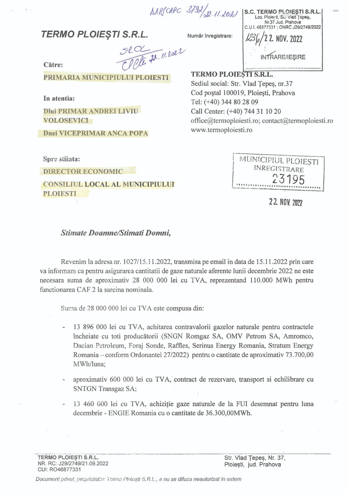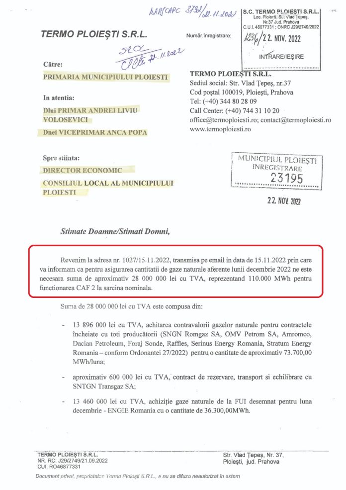 Conducerea operatorului de termoficare al Primăriei Ploiești susține că ”pentru asigurarea cantității de gaze naturale aferente lunii decembrie 2022 ne este necesară suma de aproximativ 28 000 000 lei cu TVA, reprezentând 110.000 MWh pentru funcționarea CAF 2 la sarcină nominală”.