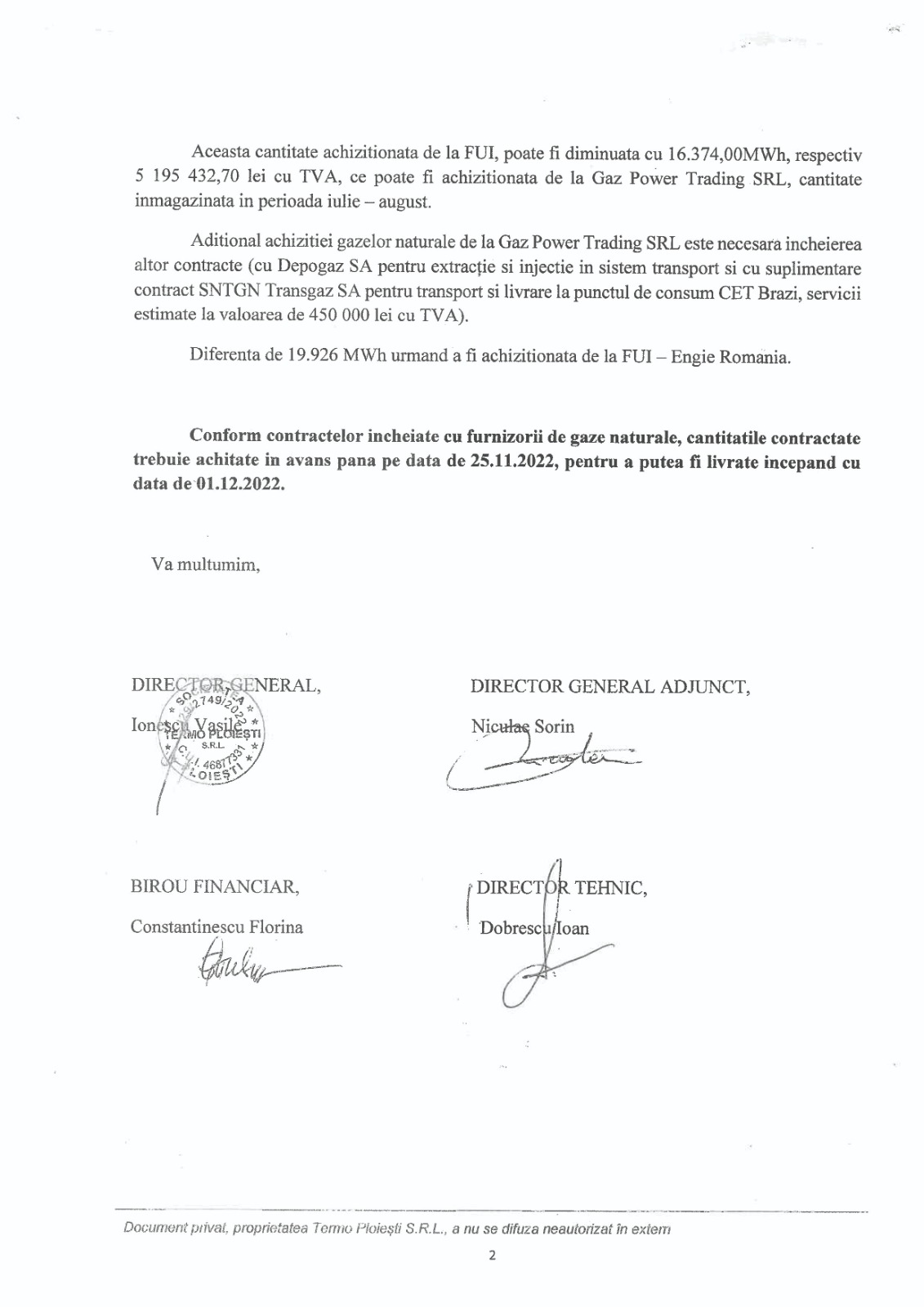 ”Aceasta cantitate achizitionata de la FUI, poate fi diminuata cu 16.374,00MWh, respectiv 5 195 432,70 lei cu TVA, ce poate fi achizitionata de la Gaz Power Trading SRL, cantitate inmagazinata in perioada iulie — august. Aditional achizitiei gazelor naturale de la Gaz Power Trading SRL este necesara incheierea altor contracte (cu Depogaz SA pentru extracție si injectie in sistem transport si cu suplimentare contract SNTGN Transgaz SA pentru transport si livrare la punctul de consum CET Brazi, servicii estimate la valoarea de 450 000 lei cu TVA). Diferenta de 19.926 MWh urmand a fi achizitionata de la FUI — Engie Romania” se arată în documentul publicat la finalul textului.