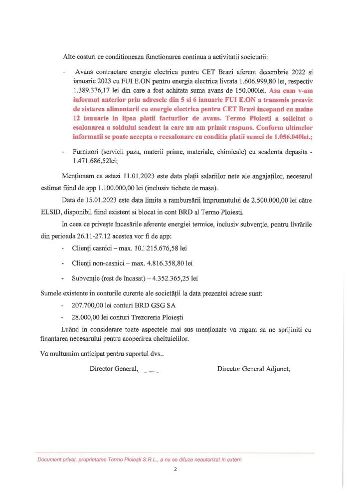 ”Așa cum v-am informat anterior prin adresele din 5 si 6 ianuarie FUI E.ON a transmis preaviz de sistarea alimentarii cu energie electrică pentru CET Brazi începând cu 12 ianuarie în lipsa plății facturilor de avans. Termo Ploiesti a solicitat o eșalonarea a soldului scadent la care nu am primit răspuns. Conform ultimelor informații se poate accepta o reeșalonare cu condiția plății sumei de 1.056.0401ei” se arată în documentul citat.