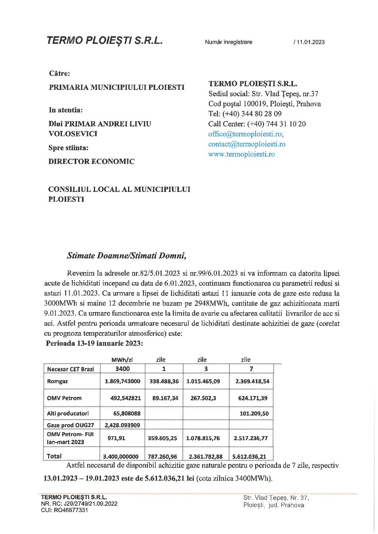 Observatorul Prahovean publică o nouă adresă pe care conducerea Termo Ploiești a transmis-o primarului Andrei Volosevici, spre știința Consiliului Local, cu privire la lipsa gazelor necesare pentru a livra la parametri optimi căldură și apă caldă.