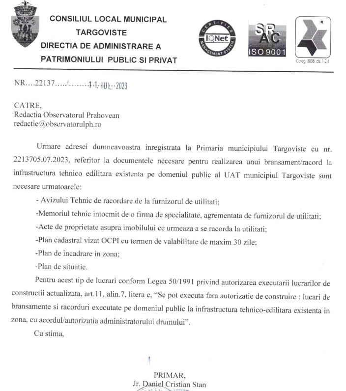 ”Nu doar Primăria Ploiești cere autorizație de construire pentru branșamente, ci toate orașele pentru că toate lucrările, fie de gaze, Electrica sau apă- canal, prin fișa de soluție au nevoie de certificat de urbanism și autorizație de construire” a transmis conducerea Direcției de Urbanism din Primăria Ploiești.