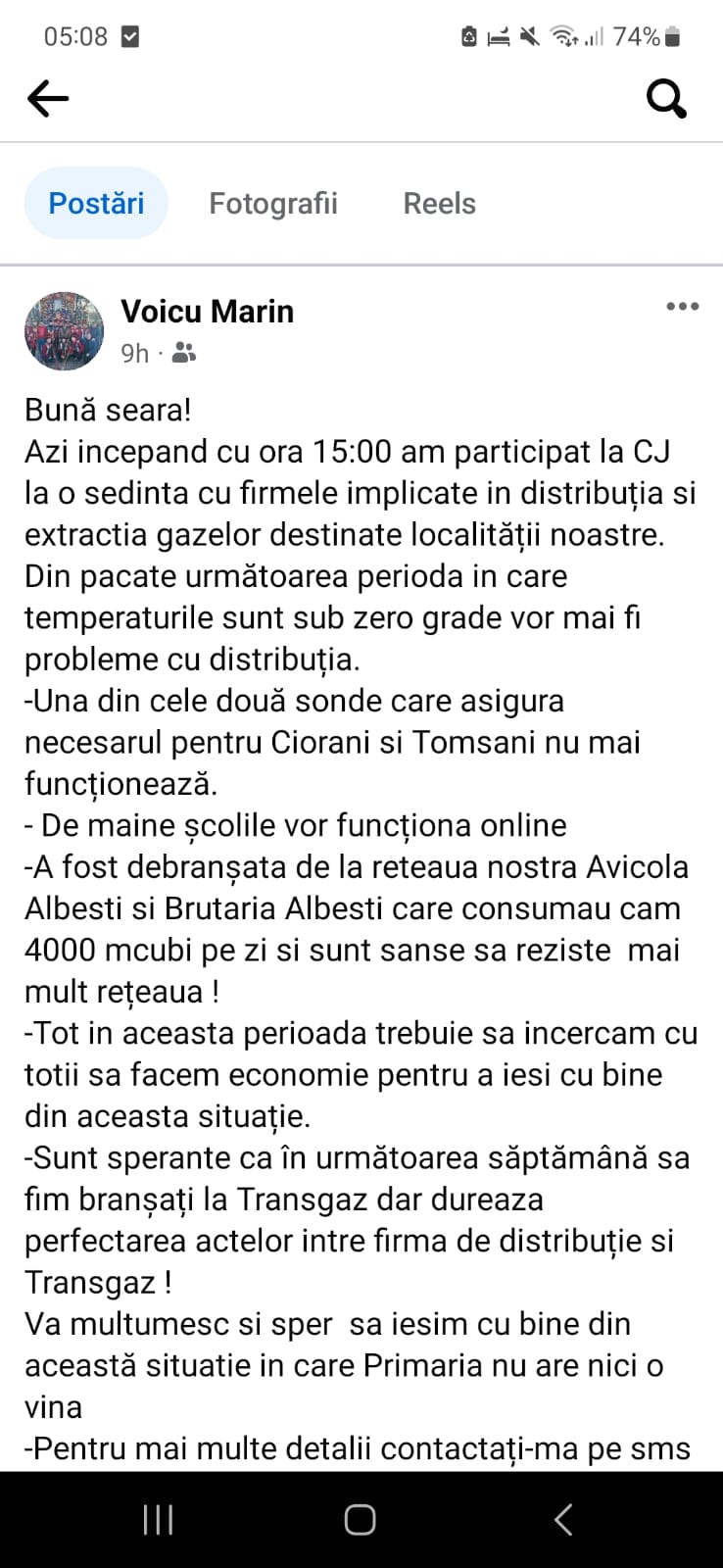 Ieri, primarul comunei, Marin Voicu, a transmis pe Facebook locuitorilor că această criză s-a produs din cauza faptului că una din cele două sonde care asigura necesarul de gaze pentru Ciorani nu mai funcționează, iar școlile vor funcționa online.