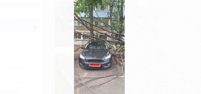 Un copac uscat a căzut peste o mașină.