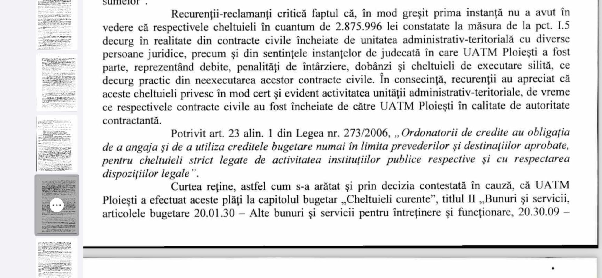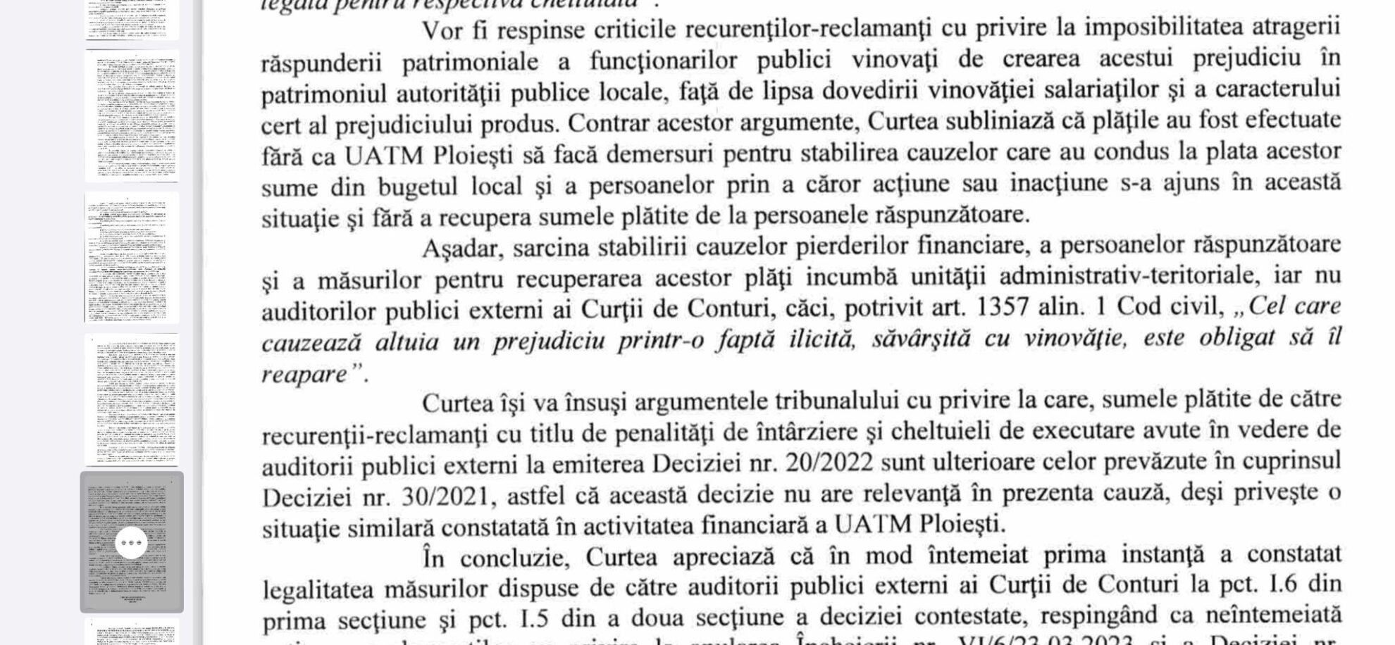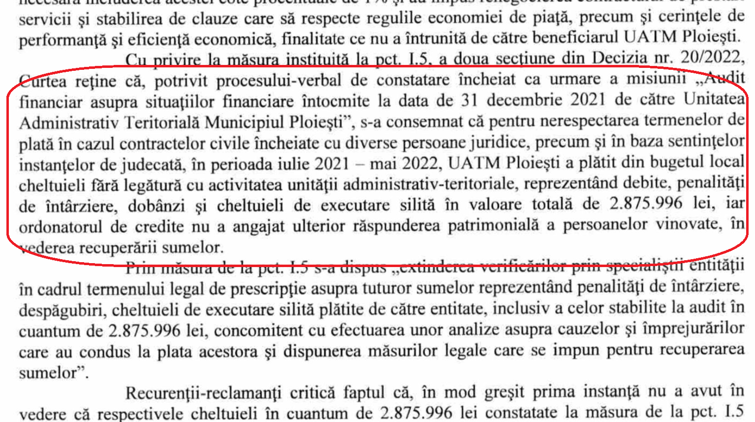 În procesul pe care primăria l-a intentat Camerei de Conturi Prahova, Curtea de Apel Ploiești a constatat că sumele achitate din bani publici cu titlu de penalități de întîrziere și cheltuieli de executări silite nu au legătură cu activitatea primăriei și pasivitatea autorității locale de a nu lua măsurile necesare pentru recuperarea sumelor achitate prin atragerea răspunderii patrimoniale a funcționarilor publici vinovați! În plus, plata acestor sume s-a făcut fără o prevedere bugetară, adică ilegal!