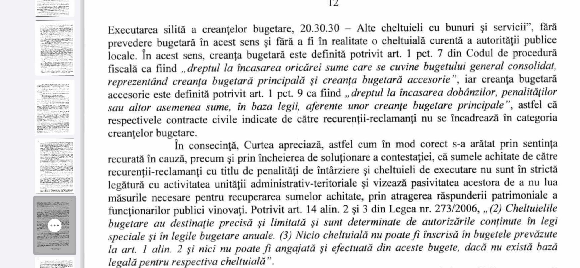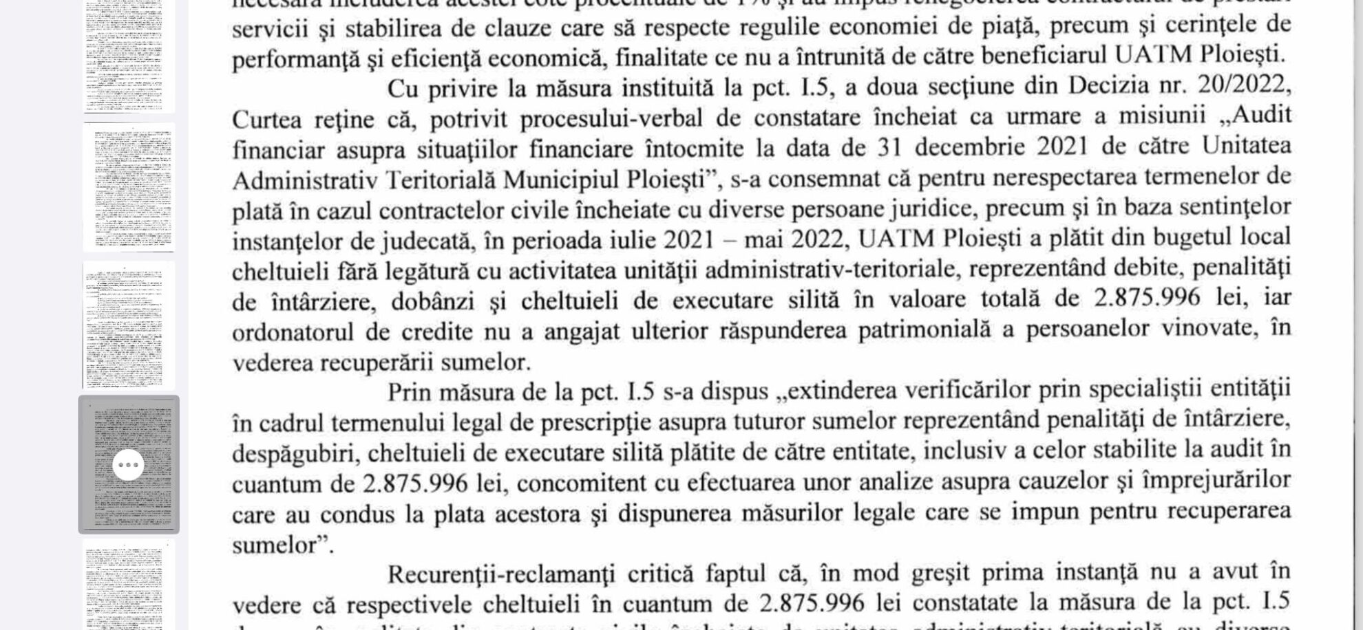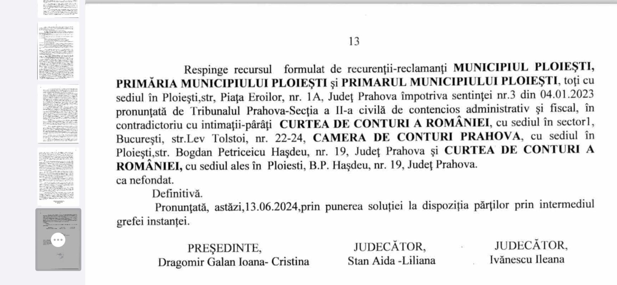 În procesul pe care primăria l-a intentat Camerei de Conturi Prahova, Curtea de Apel Ploiești a constatat că sumele achitate din bani publici cu titlu de penalități de întîrziere și cheltuieli de executări silite nu au legătură cu activitatea primăriei și pasivitatea autorității locale de a nu lua măsurile necesare pentru recuperarea sumelor achitate prin atragerea răspunderii patrimoniale a funcționarilor publici vinovați! În plus, plata acestor sume s-a făcut fără o prevedere bugetară, adică ilegal!