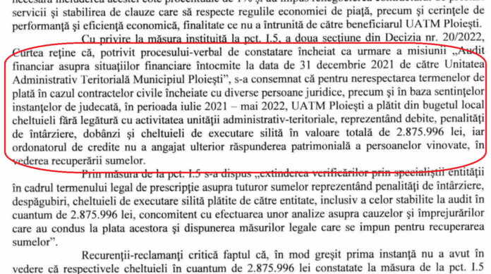 Primăria Ploiești a plătit nejustificat 2.875.996 lei reprezentând debite, penalități de întârziere, dobânzi și cheltuieli de executare siltă pentru nerespectarea termenelor de plată pentru diverse lucrări și servicii.