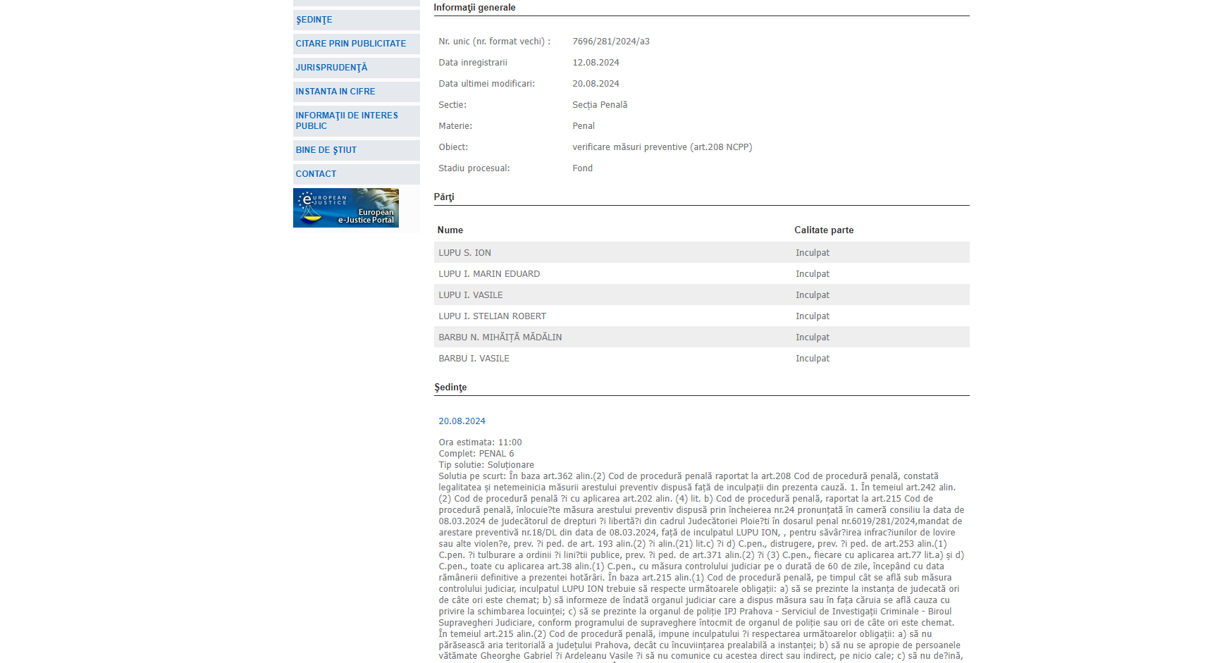”În temeiul art.242 alin.(2) Cod de procedură penală și cu aplicarea art.202 alin. (4) lit.b) Cod de procedură penală, raportat la art.215 Cod de procedură penală, înlocuiește măsura arestului preventiv dispusă prin încheierea nr.24 pronunţată în cameră consiliu la data de 08.03.2024 de judecătorul de drepturi și libertăți din cadrul Judecătoriei Ploiești în dosarul penal nr.6019/281/2024, mandat de arestare preventivă nr.22/DL din data de 08.03.2024, pentru săvârșirea infracțiunilor de lovire sau alte violențe, prev. și ped. de art.193 alin.(2) și alin.(21) lit.c) și d) C.pen., distrugere, prev. și ped. de art.253 alin.(1) C.pen. și tulburare a ordinii și liniștii publice, prev. și ped. de art.371 alin.(2) ?i (3) C.pen., fiecare cu aplicarea art.77 lit.a) şi d) C.pen., toate cu aplicarea art.38 alin.(1) C.pen., cu măsura controlului judiciar pe o durată de 60 de zile, începând cu data rămânerii definitive a prezentei hotărâri. În baza art.215 alin.(1) Cod de procedură penală, pe timpul cât se află sub măsura controlului judiciar, inculpații trebuie să respecte următoarele obligaţii: