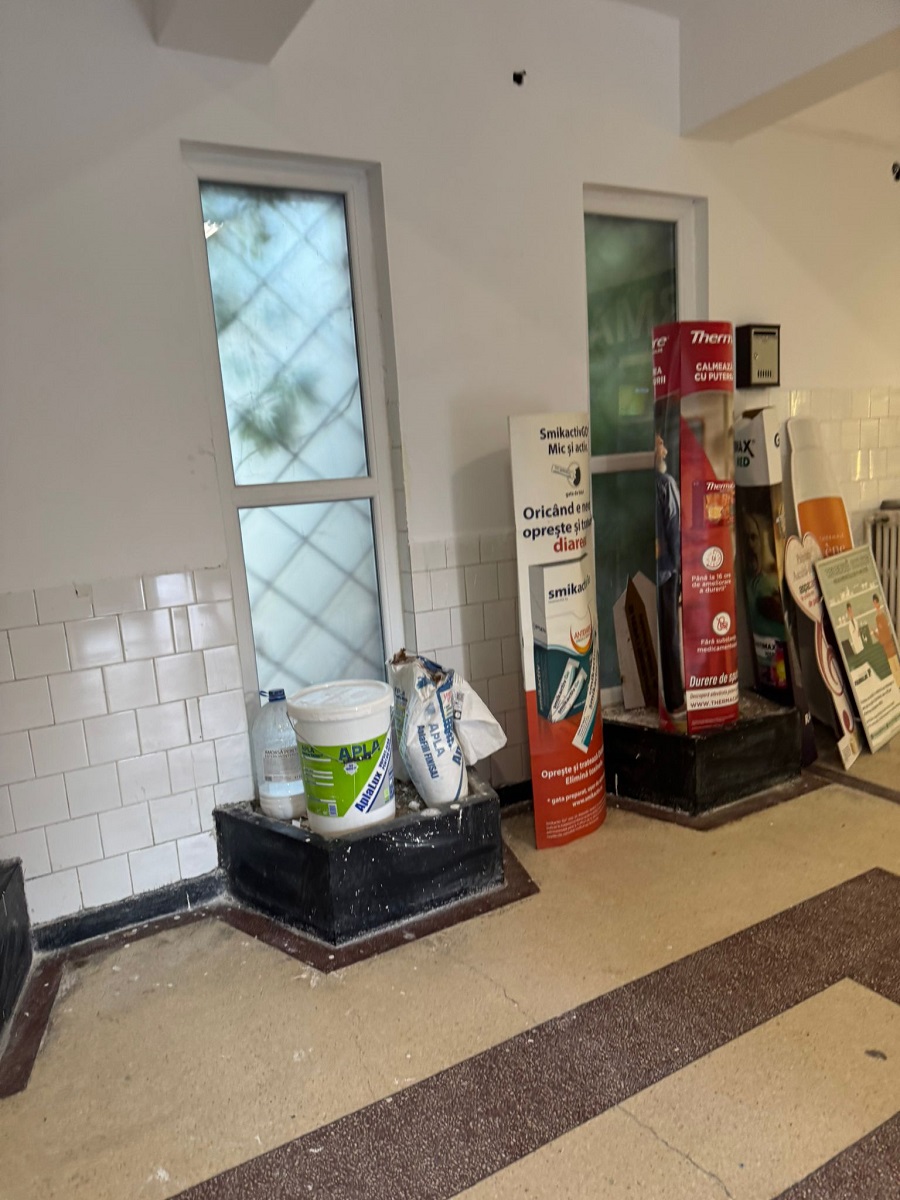 Șocant este faptul că, în holul principal, chiar în drumul pacienților, sunt depozitate două geamuri vechi, probabil demontate recent, însoțite de câteva materiale de construcție.