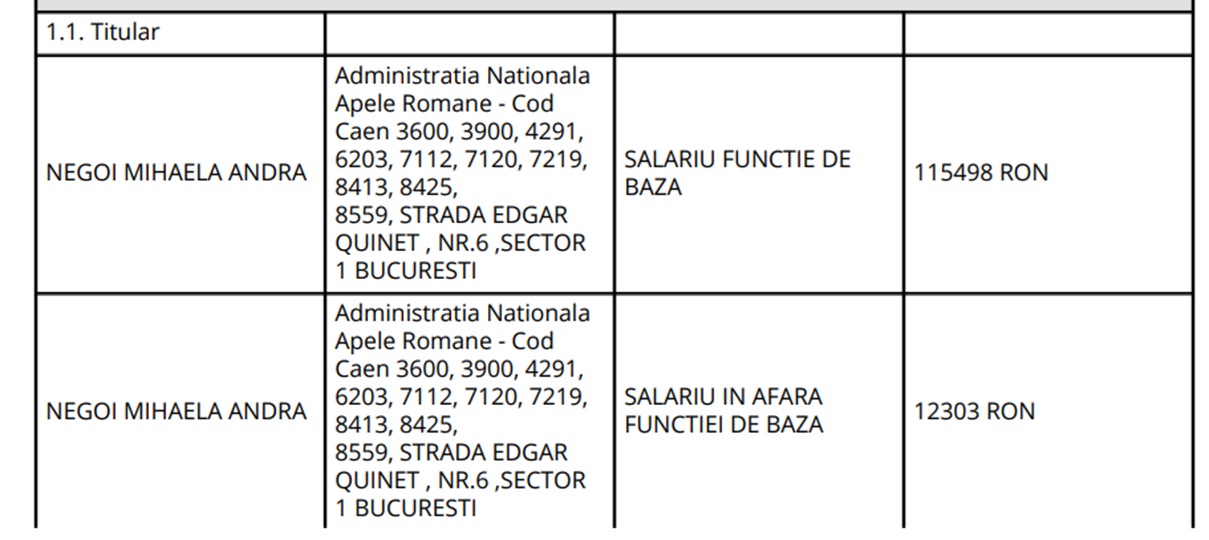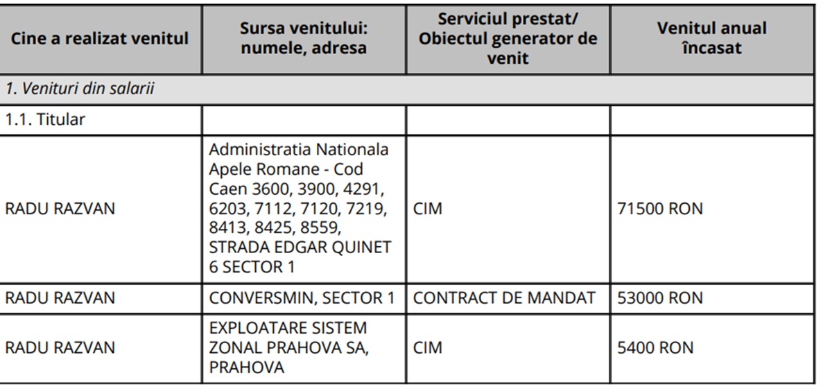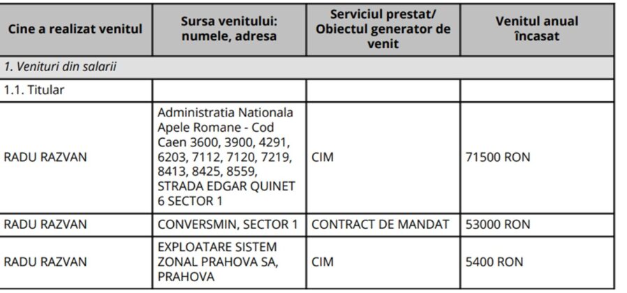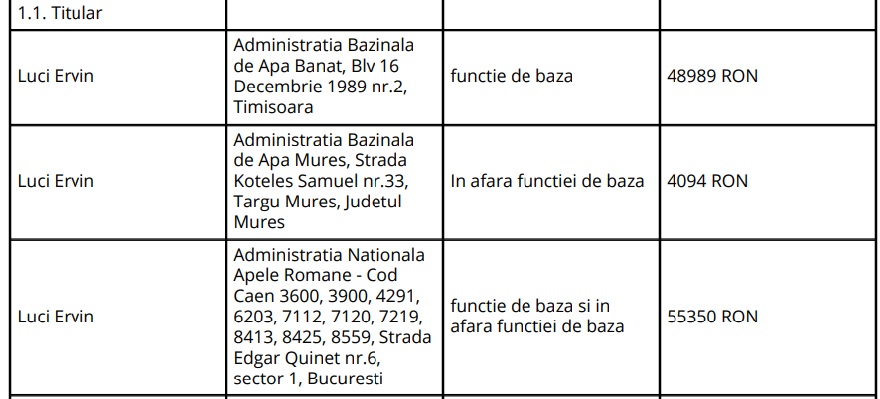 A încasat ca șef birou salariu Administrația Bazinală de Apă Buzău – Ialomița SGA Prahova suma de 59.438 lei, iar de la Administrația Națională Apele Române – Proiect SNMRI – salariu 16.950 lei.