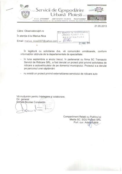 La începutul lunii iulie, SGU Ploieşti a încheiat un contract cu firma Lifting Profesional SRL, înfiinţată, ATENŢIE, pe 14 iunie!, pentru închirierea unei platforme de ridicare a maşinilor parcate neregulamentar. Asta deşi societatea aparţinând Consiliului Local Ploieşti deţine două asemenea autospeciale. Firma Lifting Profesional SRL a fost aleasă, cum altfel, în urma unei selecţii de oferte organizată de SGU Ploieşti, la care a mai participat doar Achetrans Com din Boldeşti, al cărui patron a refuzat să ofere detalii reporterului observatorulph.ro. “Sunt la volan, nu pot să vorbesc” a fost pretextul lui Cătălin Enache, patronul firmei Achetrans. Iată cum justifică SGU Ploieşti necesitatea încheierii acestei afaceri: „Autovehiculele platformă ce aparţin societăţii sunt depăşite din punct de vedere tehnic şi din cauza dimensiunilor nu pot opera şi în locuri mai puţin accesibile”. Pentru că SGU nu a avut 100.000 de euro să cumpere o platformă de ridicat maşini a apelat la o firmă, care nu avea experienţă în acest domeniu, întrucât fusese înfiinţată chiar înaintea selecţiei de oferte.