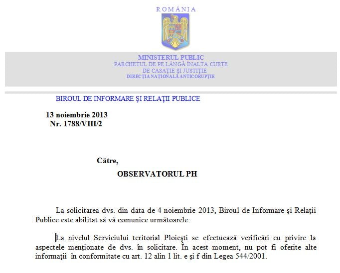 Pe 4 noiembrie, observatorulph.ro a înaintat la DNA următoarea solicitare: