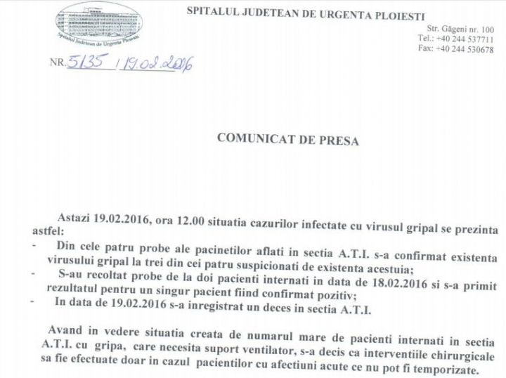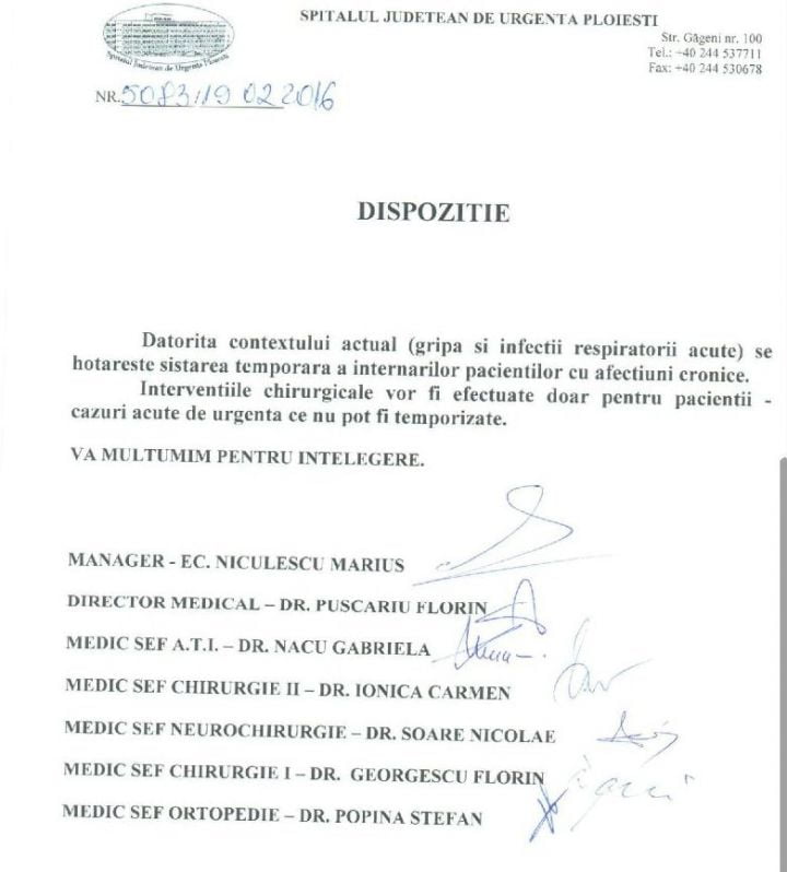 Surse din județean au declarat pentru observatorulph.ro că măsura va afecta zeci de pacienți, care nu vor mai fi operați, însă riscul ca aceștia să contacteze virusul AH1 este mult mai mare în urma intervențiilor chirurgicale.