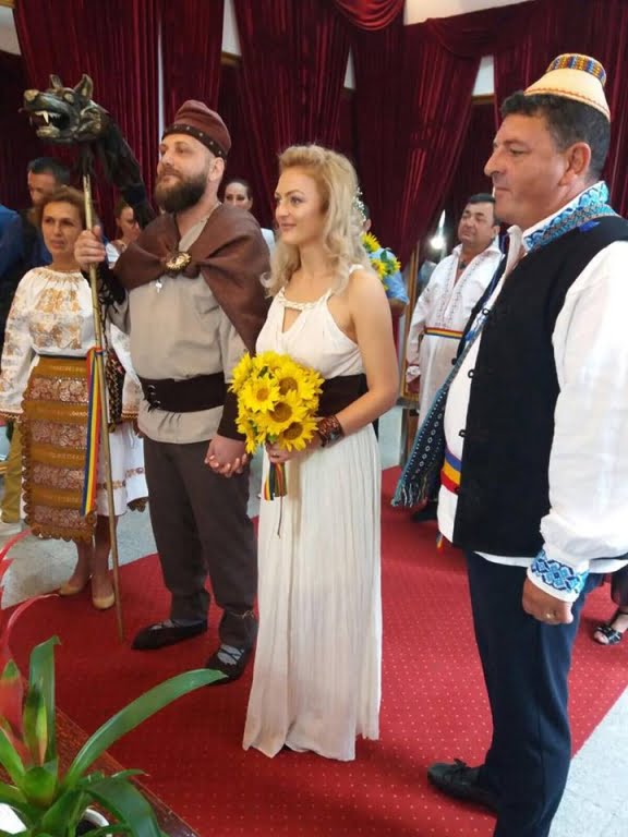 Nici naşii nu au făcut notă discordantă, chiar dacă vestimentaţia lor nu era din vremea dacilor. Un simplu port popular românesc a fost suficient pentru a păstra linia acestui eveniment. Peste puţin timp vor avea cununia religioasă şi nunta, evenimente pentru care vor adopta ţinute convenţionale. Ar fi fost interesant să-i vedem la un dans al mirilor, în costume dacice, alergând mireasa cu capul de lup în mână. Le dorim casă de piatră şi mulţi pui de daci!