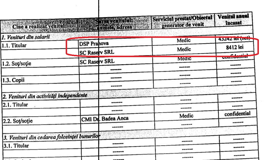 În declarația de interese a medicului Badea de la DSP Prahova nu apar contracte încheiate de firma sa cu clinici sau spitale private sau de stat, c doa veniturile obținute din activitatea prestată în timpul liber.